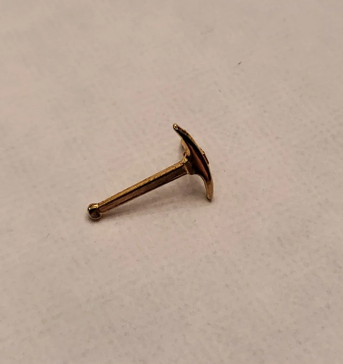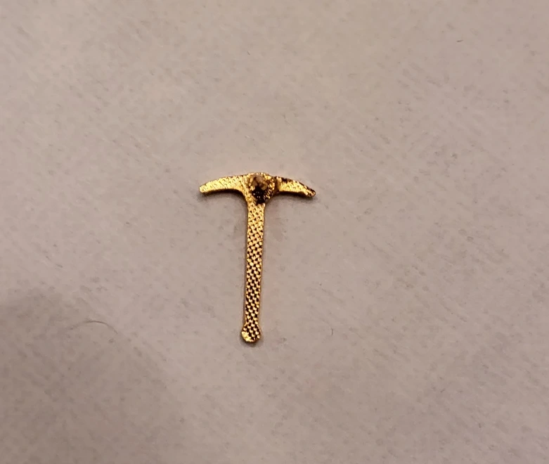 Selling a gold-coloured pickaxe lapel pin. It's in great condition and would look great on a jacket or bag!