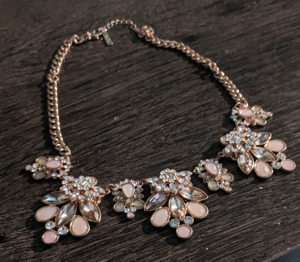 Selling a beautiful statement necklace! It features a gold-tone chain and floral designs with pink and clear stones. Perfect for dressing up any outfit!