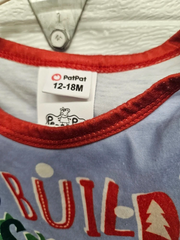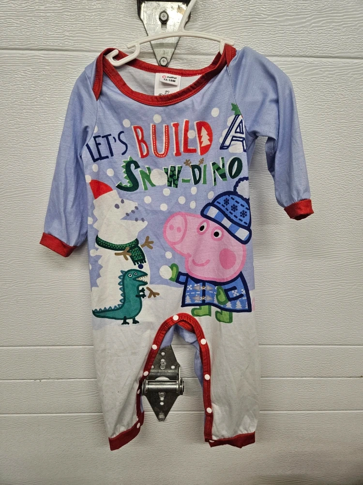 Cute romper featuring Peppa Pig, perfect for your little one! It's size 12-18M and has a fun "Let's Build A Snow-Dino" design