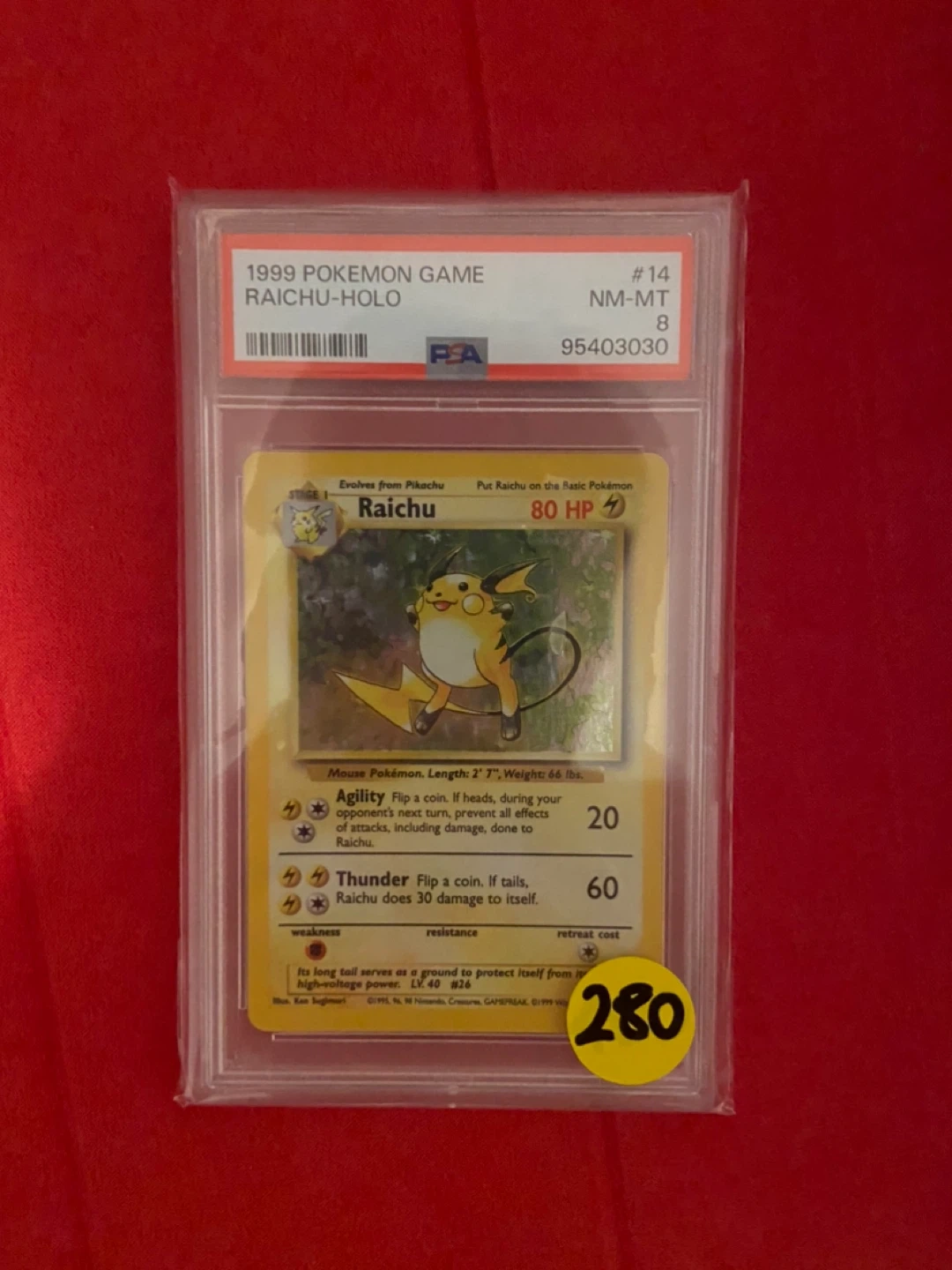 Selling a 1999 Pokemon Game Raichu-Holo card, graded NM-MT 8 by PSA. This card features Raichu evolving from Pikachu, with an HP of 80. Its Agility attack does 20 damage, and Thunder does 60 damage. A great addition to any Pokemon collection!