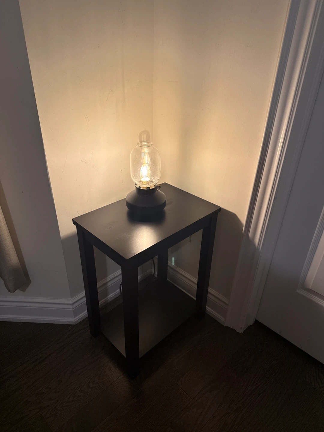 Selling a cute black end table. It's in great condition and would be perfect for a bedroom or living room. It has a shelf at the bottom for extra storage