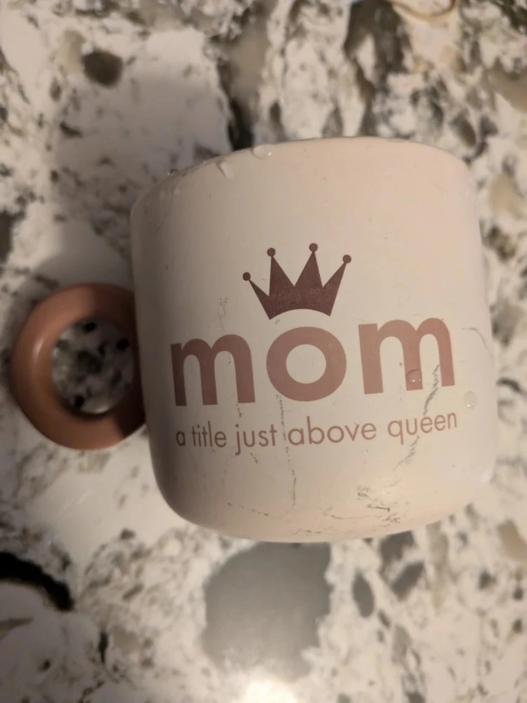 Selling a cute Indigo mug that says 'Mom, a title just above queen'! It's dishwasher and microwave safe, perfect for daily use. There are some signs of wear and tear.