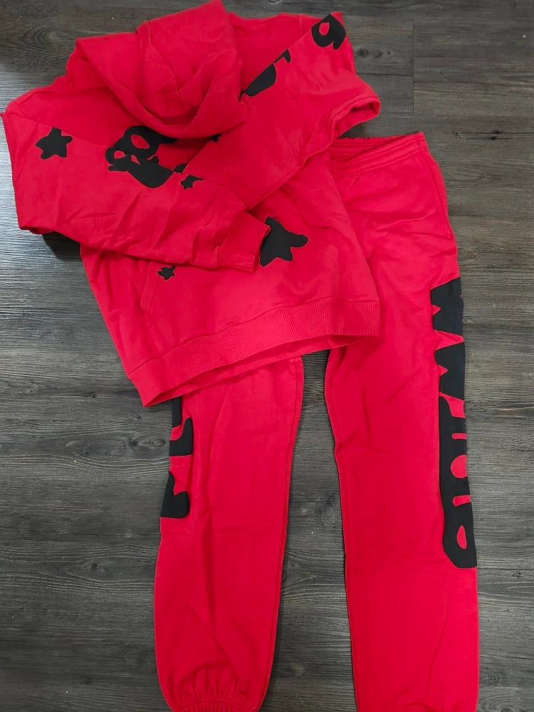 Selling a Sp5der red hoodie and sweatpants set. The hoodie and sweatpants are both size small and in good condition. The set features a unique design with black stars and Sp5der logo. Perfect for casual wear!