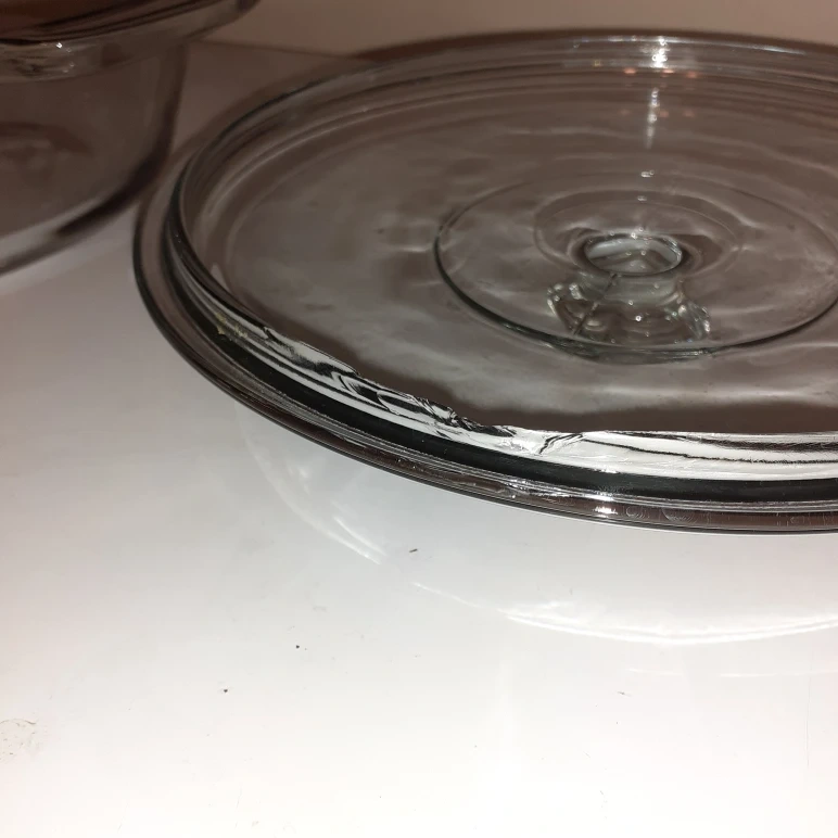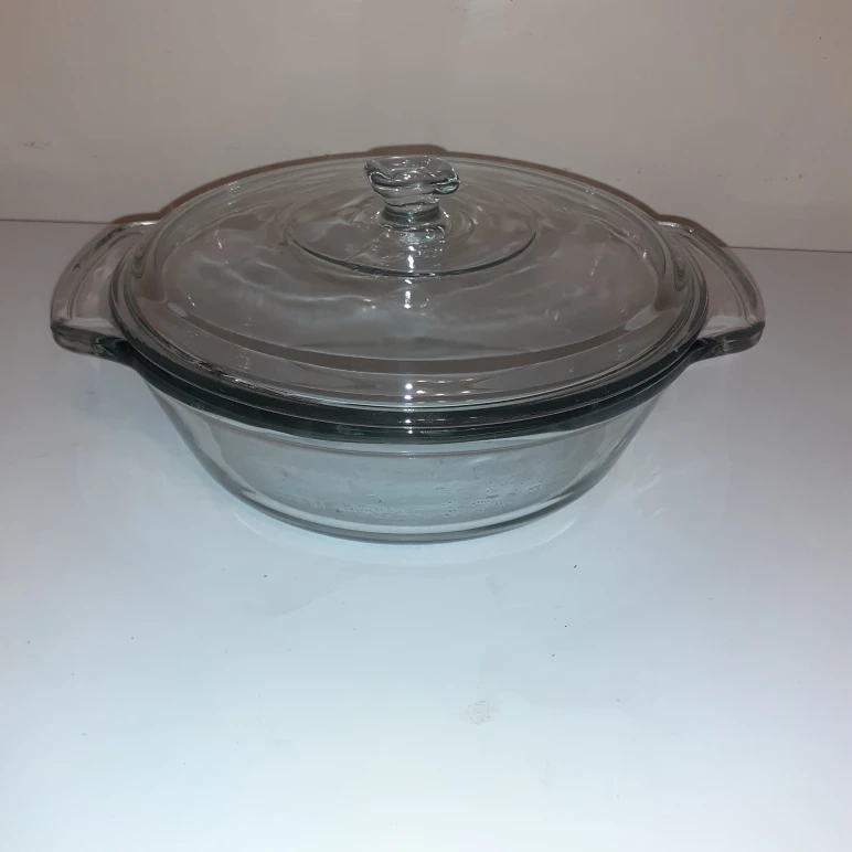 Measures approximately 9 inches in diameter and 4 inches in height. There is a small chip on the lid and there are a few scratches, but otherwise in a great condition.
