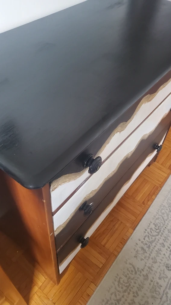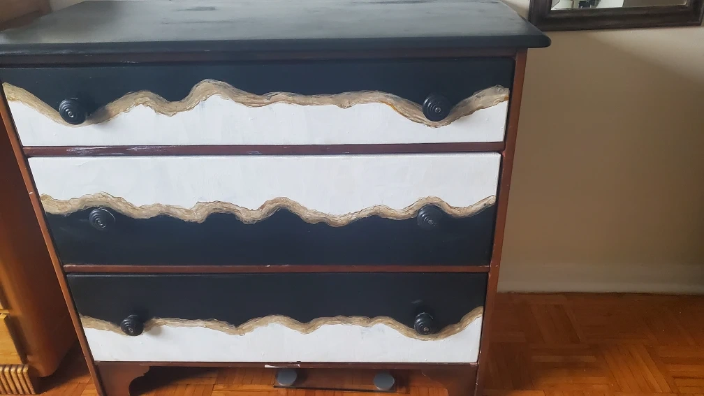 Here's a sturdy 3-drawer dresser with a unique painted design. The dresser features a black top, white and black drawers with a gold, and wooden sides. It's a great piece for adding some character to any room!