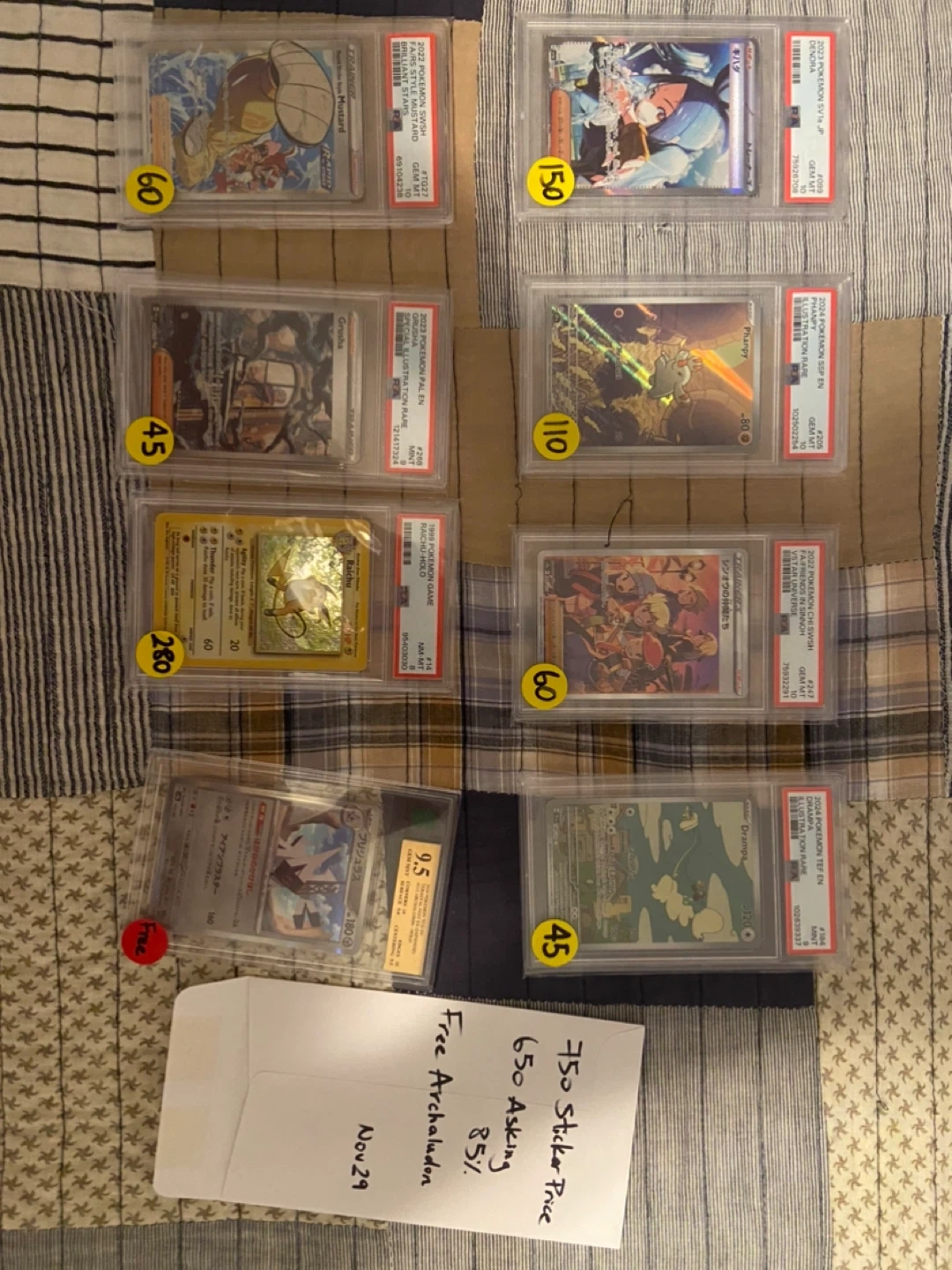 Selling a collection of PSA graded Pokémon cards. There are cards from various sets and conditions, including Gem Mint 10,9,8.