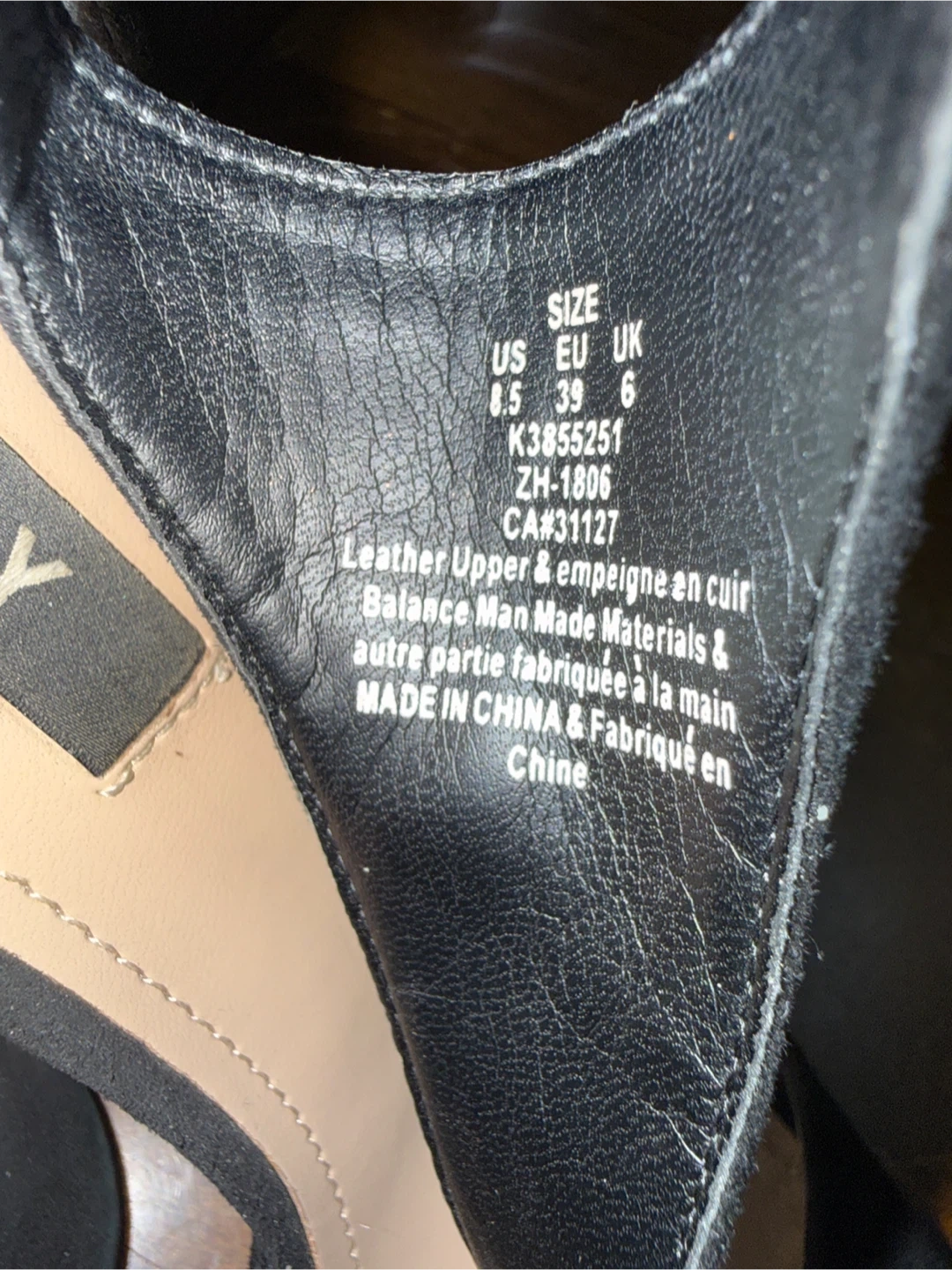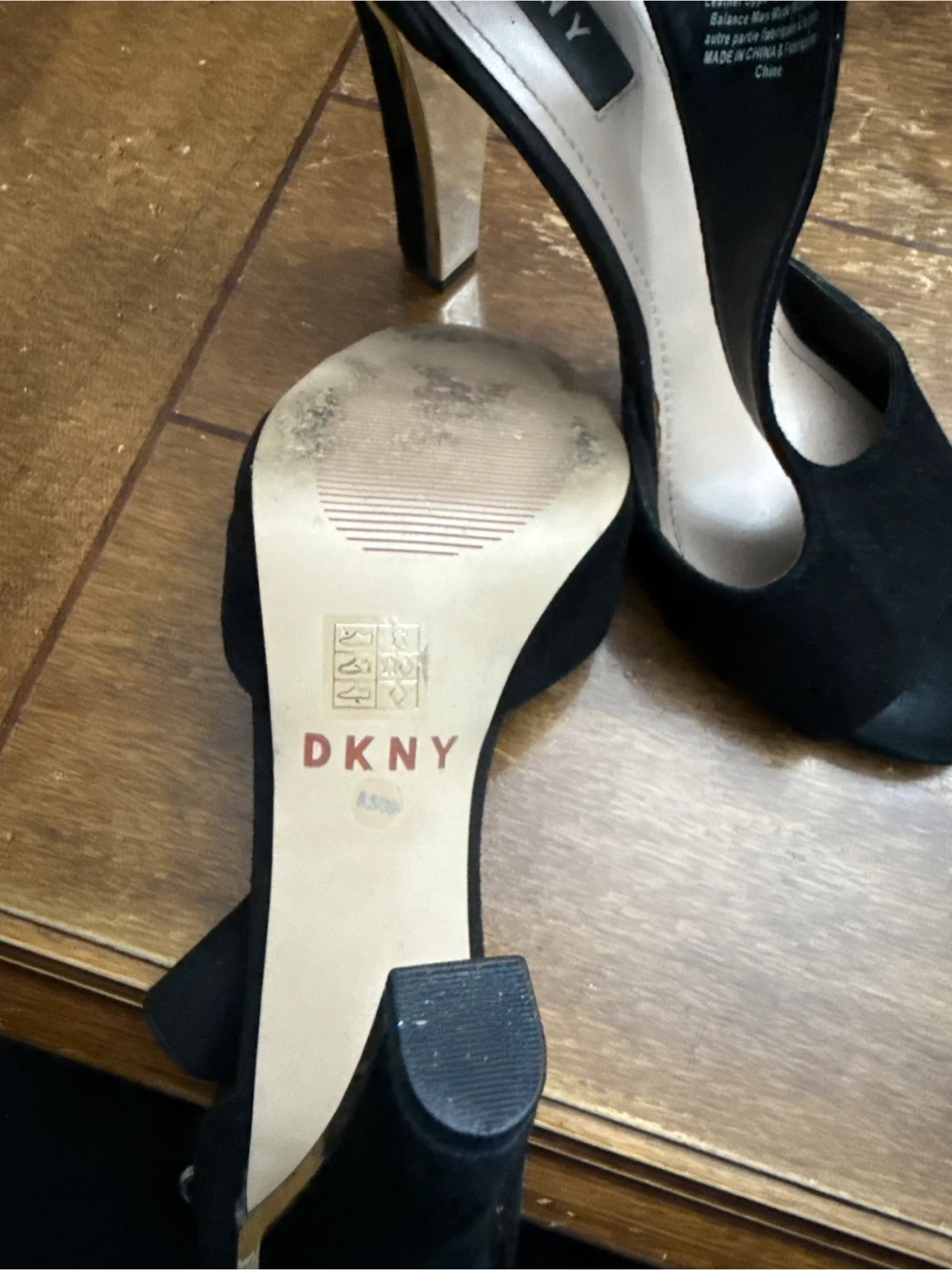 Stylish black heels from DKNY in size 8.5! These heels feature a leather upper and balance man-made materials. They're in good condition and ready for a new home!