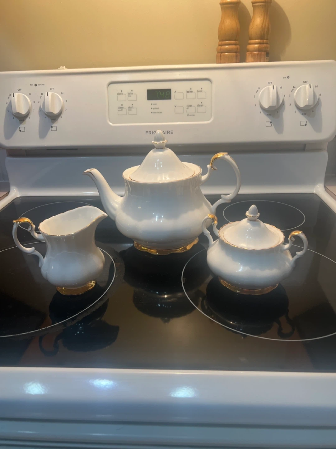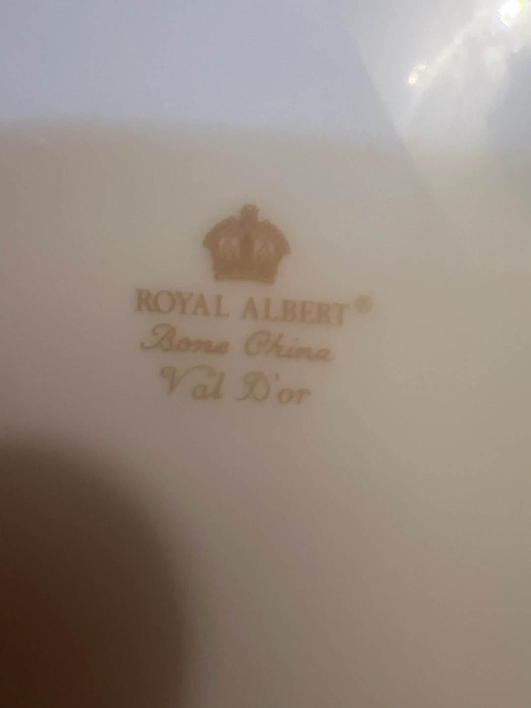 Selling a beautiful Royal Albert Bone China tea set in the Val D'or pattern. This set includes a teapot, sugar bowl, and creamer, all in excellent condition with gold trim. Perfect for tea parties or adding a touch of elegance to your home!