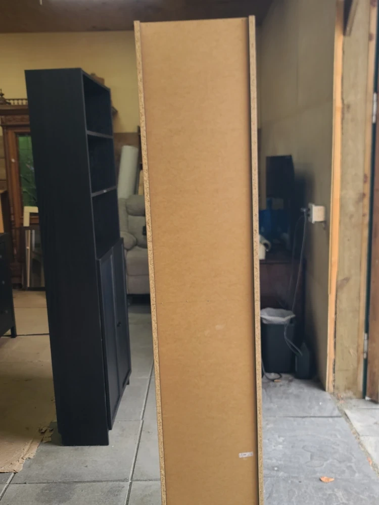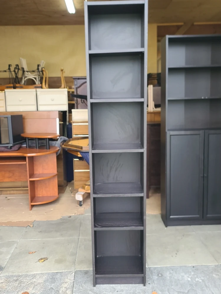 Black wooden bookshelf with 6 shelves. In good condition, minor scuffs on the shelves. Sturdy and stable. Measurements: 16" × 11" × 80". Delivery can be arranged. Viewing and pickup by appointment.