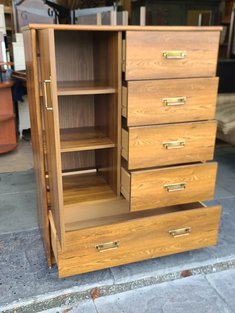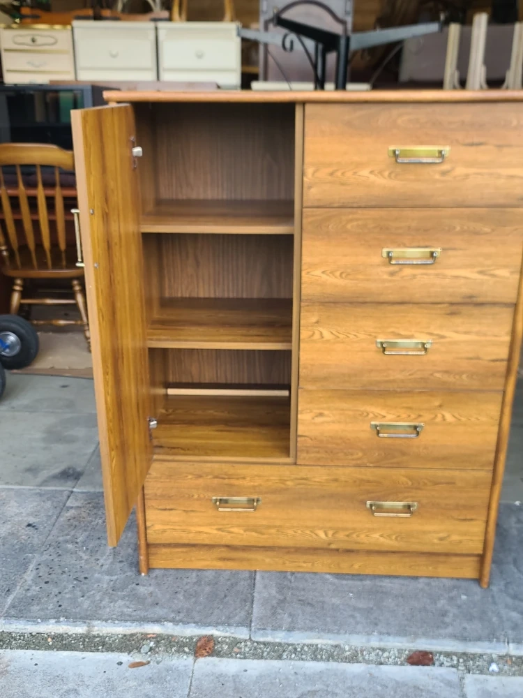 Mcm Oak dresser with cabinet. Has 4 drawers on the right and a door that opens to shelves. In good condition, sturdy and functional. Measurements: 36" across the front by 19 1/2" deep by 47" high. Delivery can be arrange. Viewing and pickup by appointment.