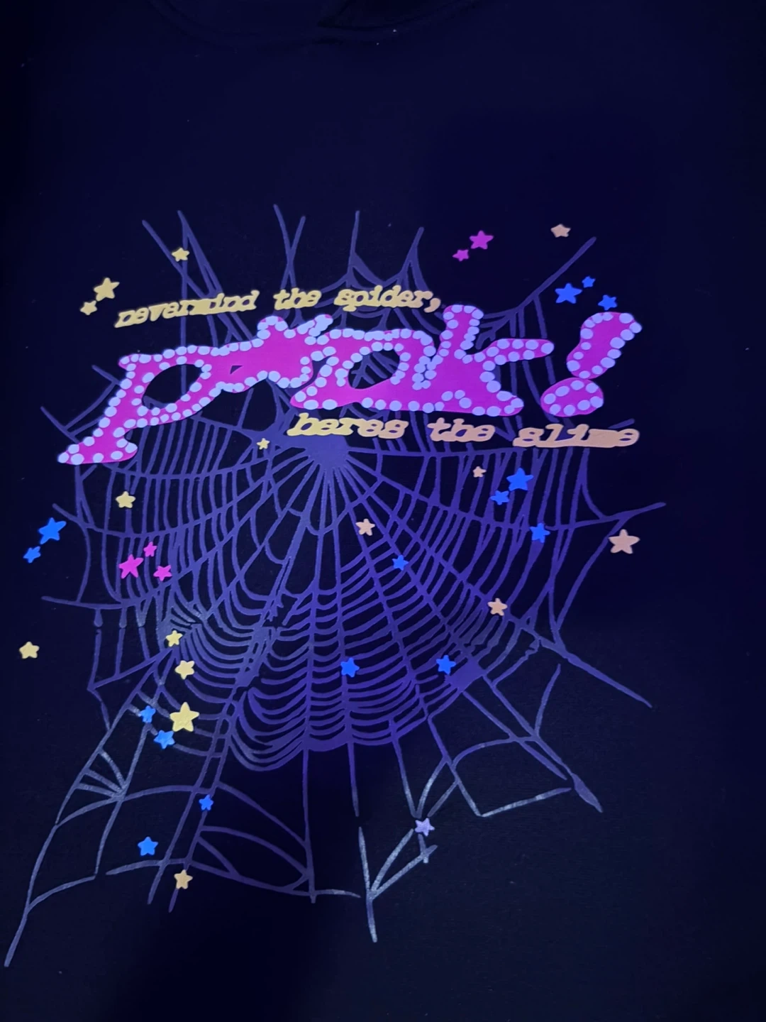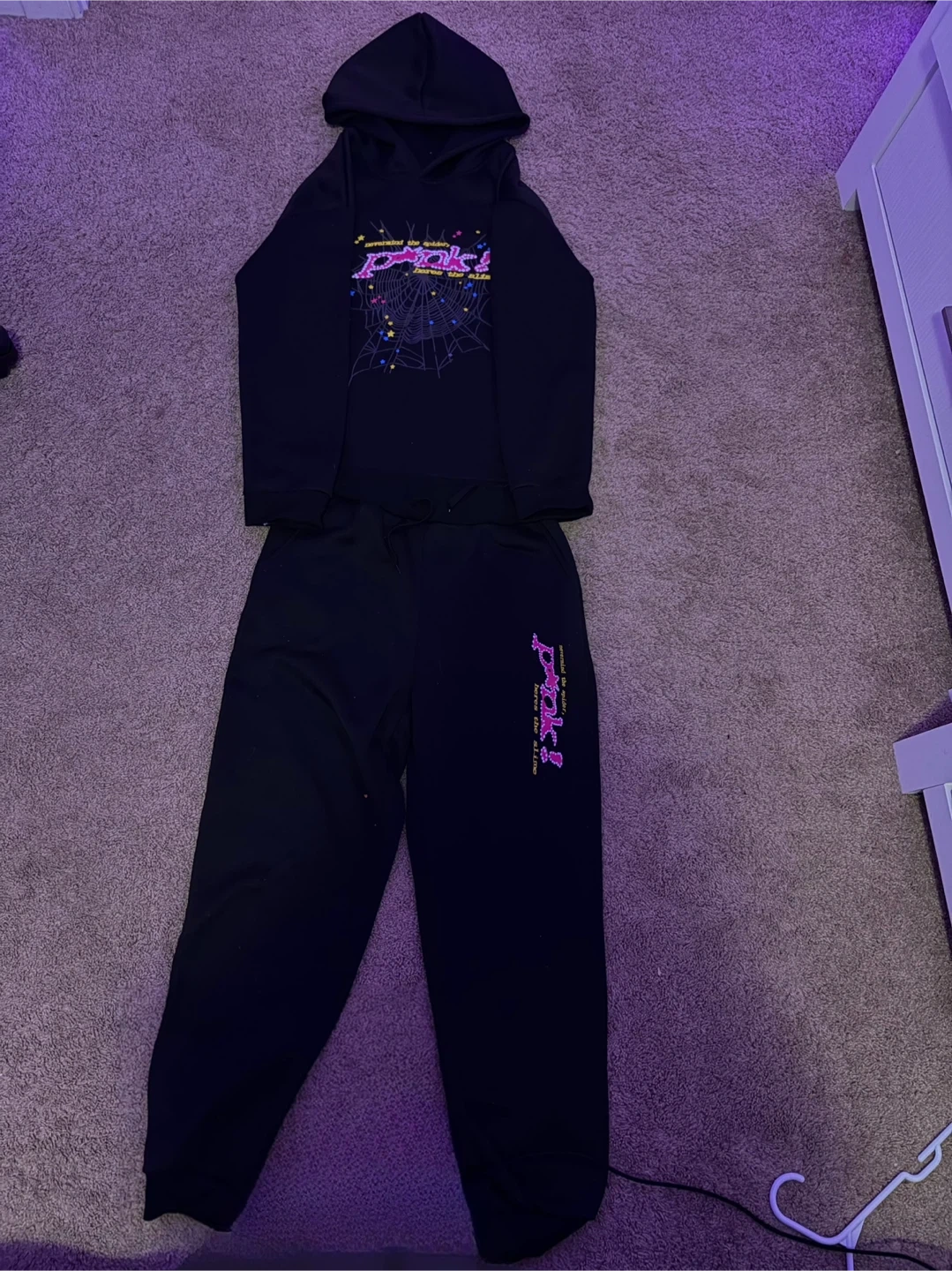 Selling a Drakespider black hoodie and sweatpants set. The design features the text 'nevermind the spider, here's the slime' with a spiderweb graphic. Great for fans of the brand!