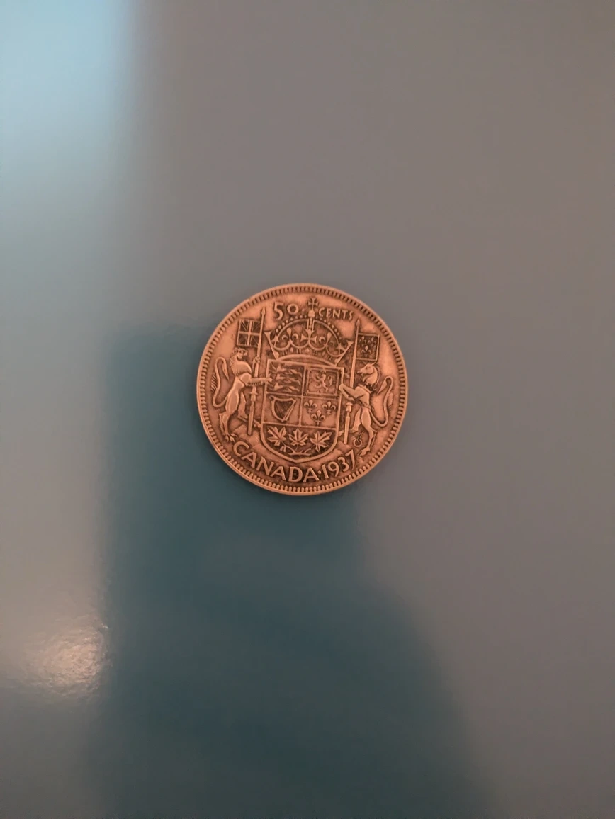 Selling a Canadian 50 cent coin from 1937. It features King George VI on one side and the Canadian coat of arms on the other. A great piece for any coin collector!