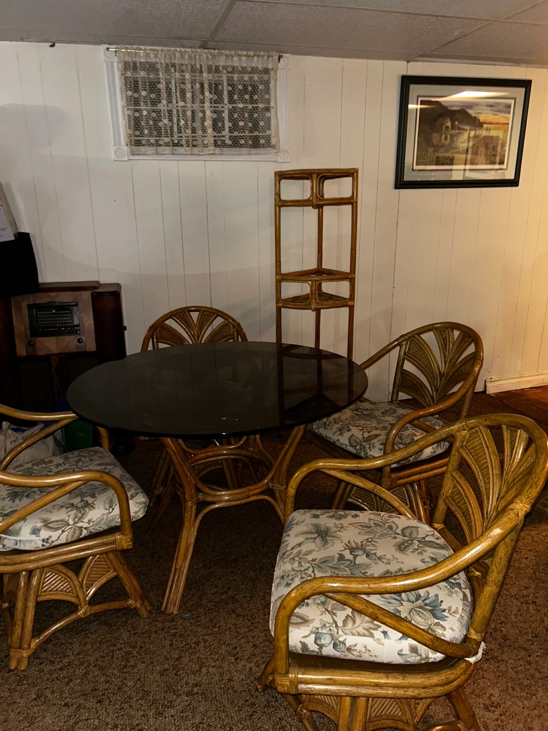 Selling a vintage rattan dining set! It includes a round glass-top table and four matching chairs with floral cushions. The set is in good condition, with some minor wear consistent with its age.