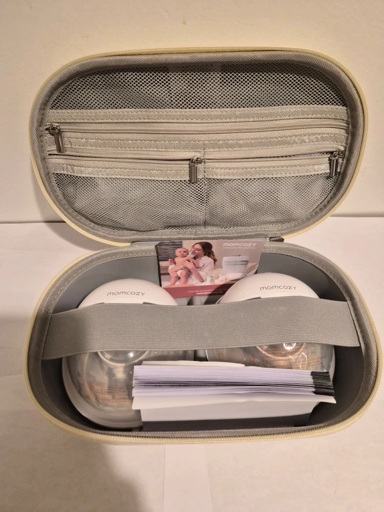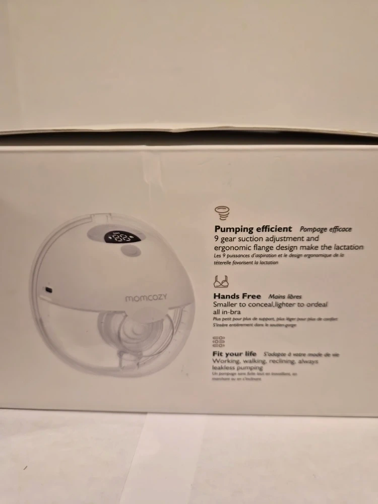 Selling a Momcozy M5 wearable breast pump. It's designed for hands-free use, making it easier to pump while working, walking, or reclining. The box is included! It features 9 gear suction adjustment and an ergonomic flange design to make lactation more efficient never used never tested