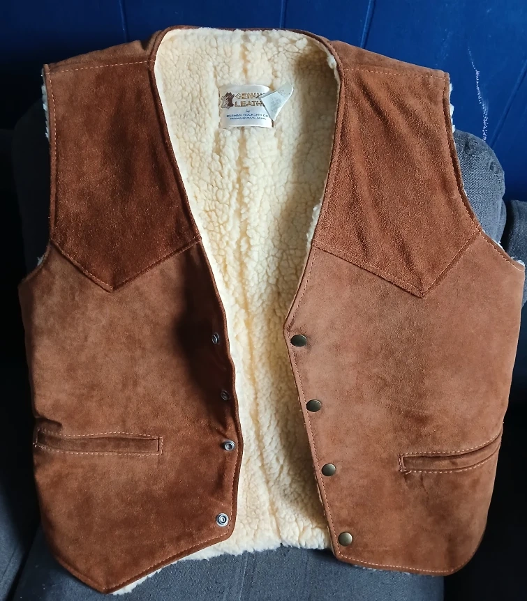 Selling a gently used Berman Buckskin Co. suede leather vest. It's a size 42 and features a cozy sherpa lining. The vest is in great condition and perfect for adding a touch of western style to your wardrobe!