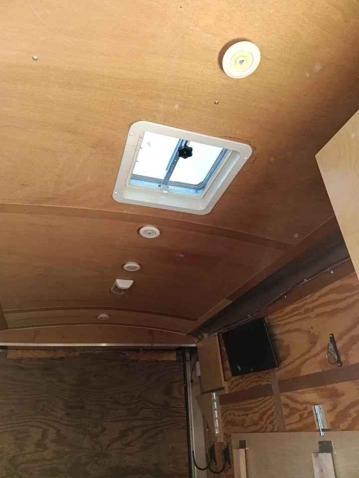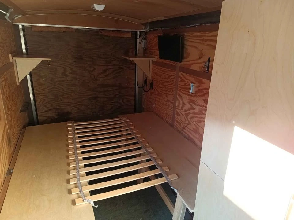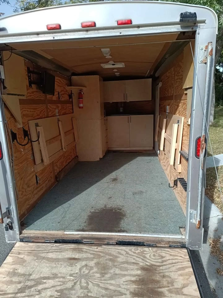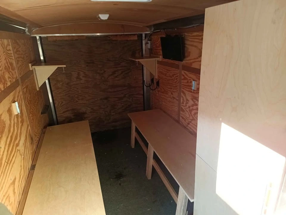 Ice fishing/hunting trailer. Can also be used for camping. 7 pin trailer connector. Has trailer brakes. Interior is 14 feet long and 6 feet wide.