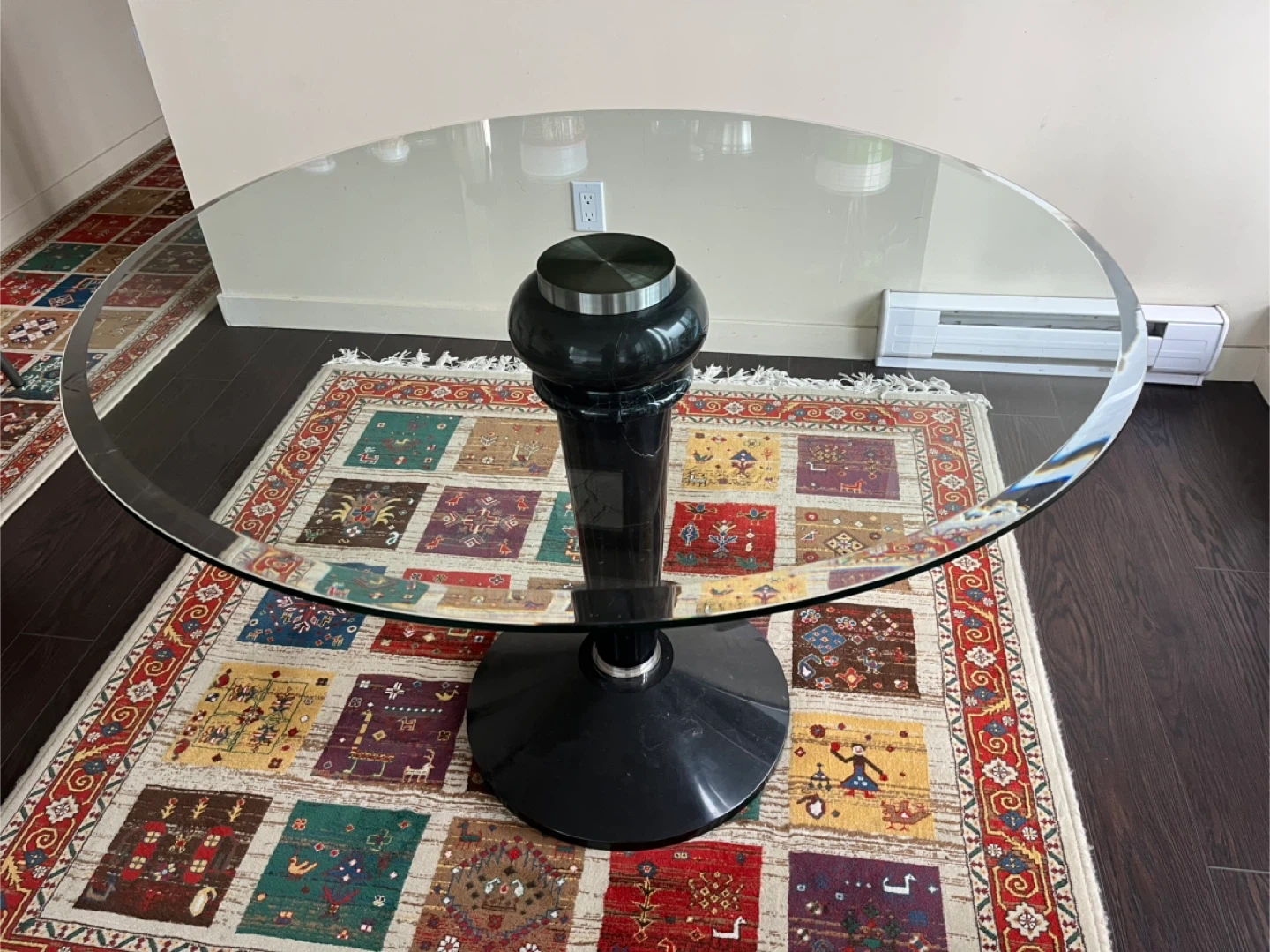 Selling a dining table with a glass top and a striking black marble base. It's a stylish piece that would look great in any dining room or kitchen! The base is made of black marble, adding a touch of elegance and durability. The glass top is in good condition, offering a sleek and modern look. A unique and eye-catching design!