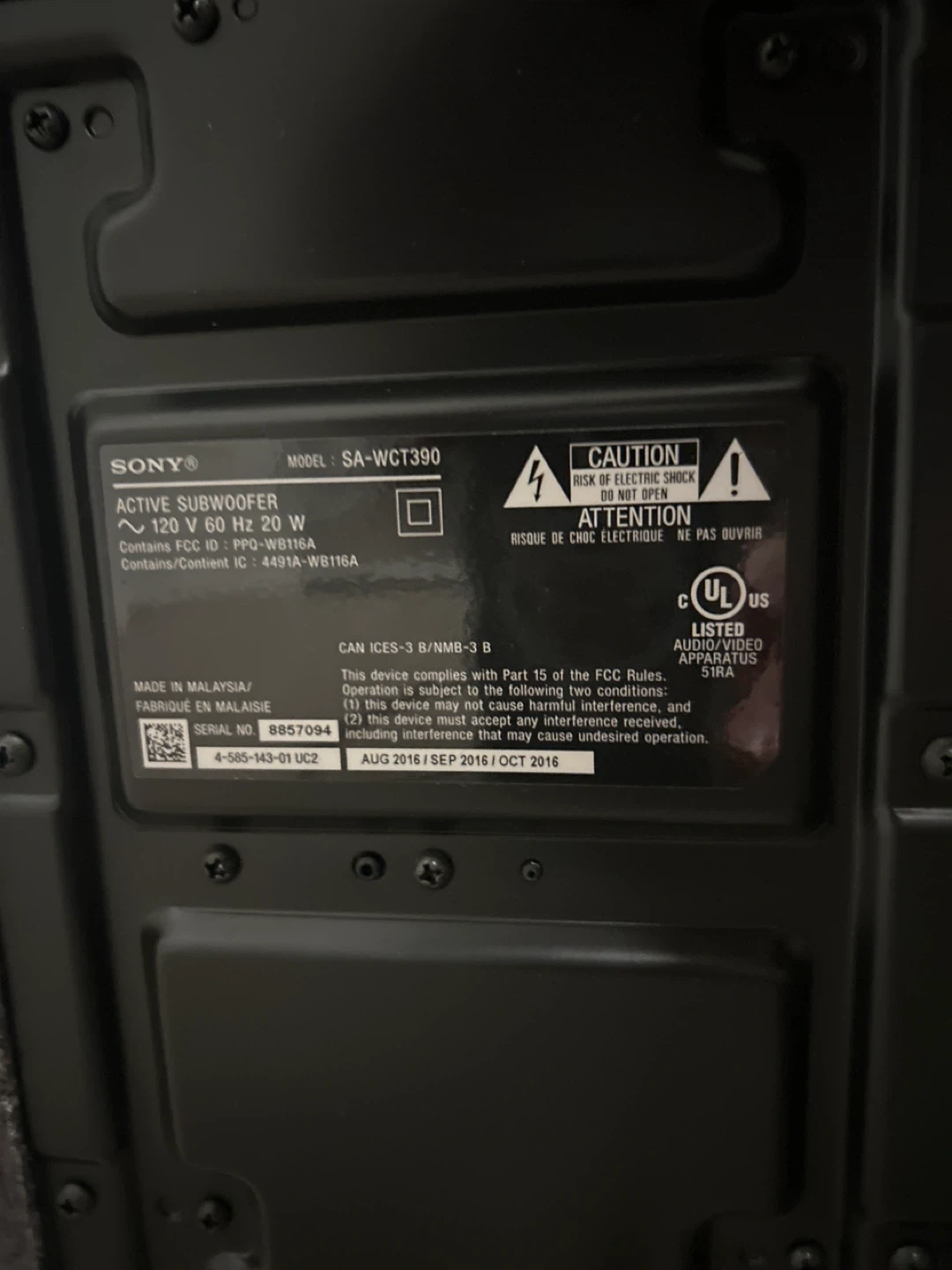 Selling a Sony active subwoofer, model SA-WCT390. It operates at 120 V, 60 Hz, and 20 W. Perfect for enhancing your home theatre experience!