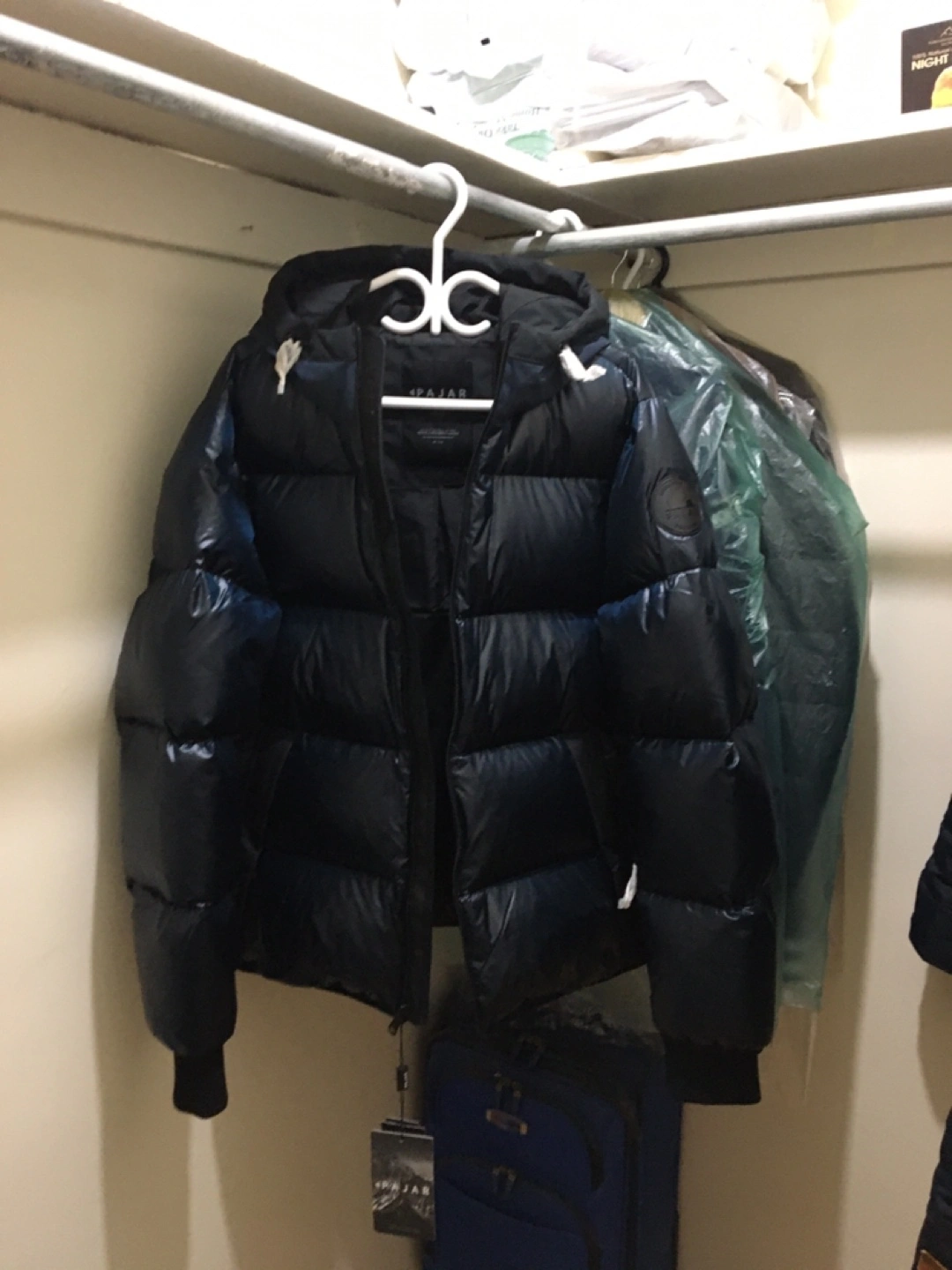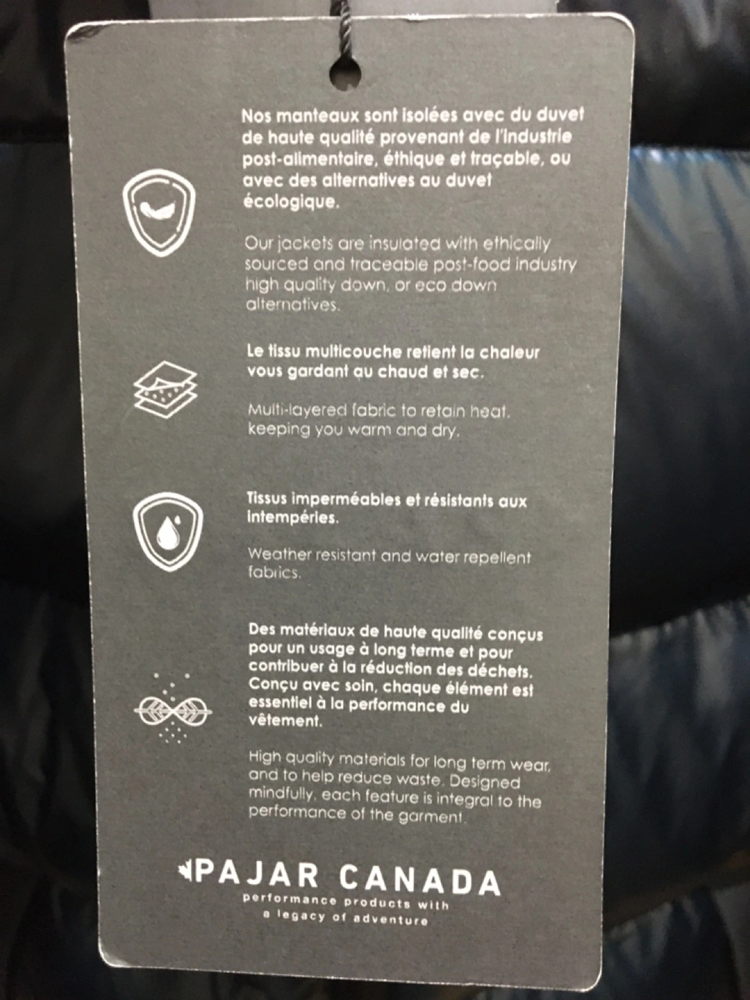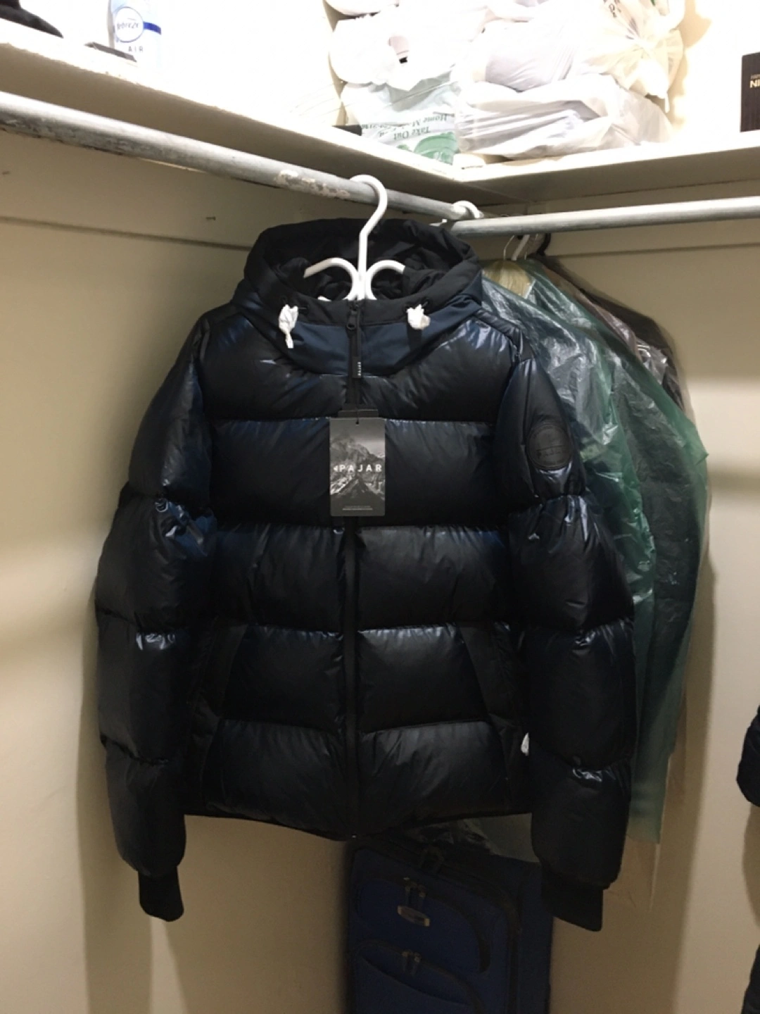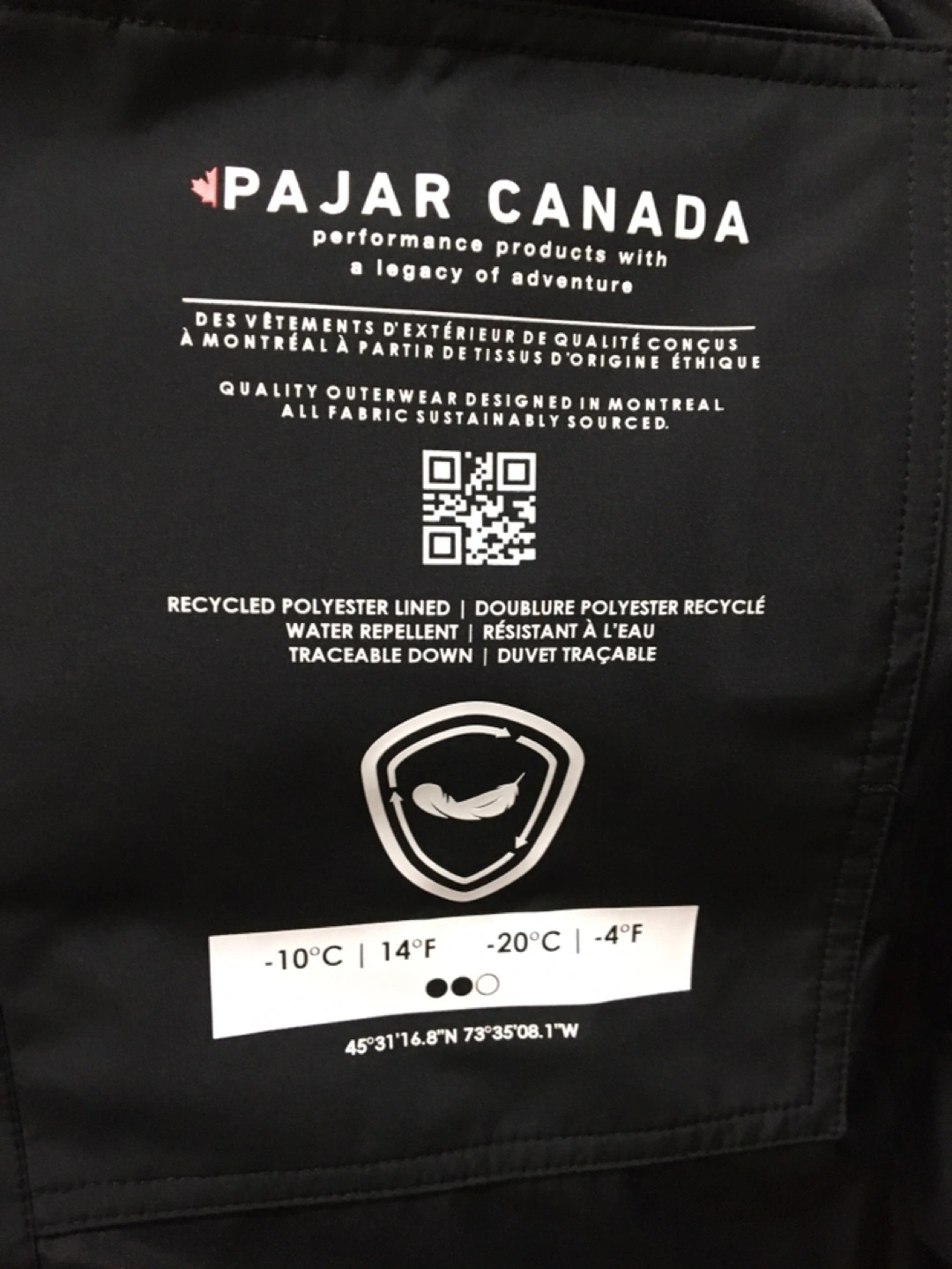This is a Pajar puffer jacket in black. It's insulated with ethically sourced and traceable post-food industry high-quality down, or eco down alternatives. The multi-layered fabric retains heat, keeping you warm and dry, plus it's weather-resistant and water-repellent pick up at steeles and Bathurst cash only