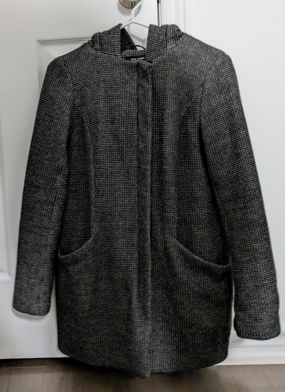 Selling a New Look hooded coat in UK 10/ US 6. It's in great condition and perfect for layering! The coat has a stylish, textured pattern and functional pockets. A versatile addition to any wardrobe!