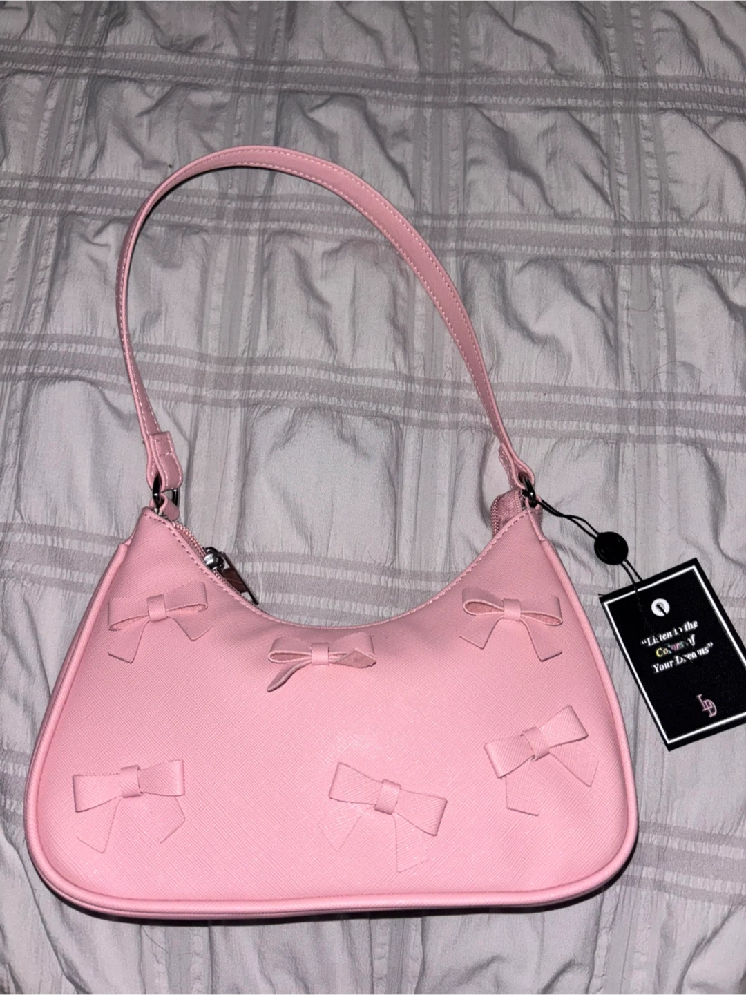 This adorable Luv Betsey shoulder bag is in a lovely shade of pink and features cute bow details. It's perfect for adding a touch of sweetness to any outfit!