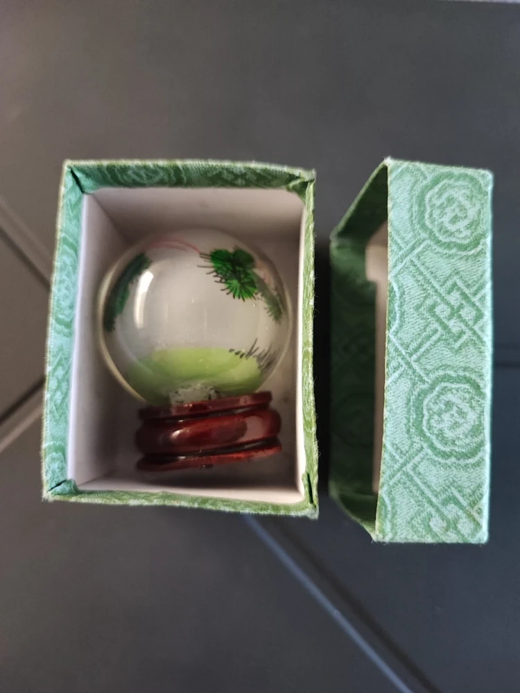 This is a lovely snow globe featuring a cardinal bird perched on a tree branch. It comes with a wooden stand and its original box. A charming addition to any collection or a sweet gift!