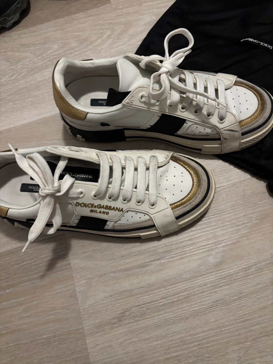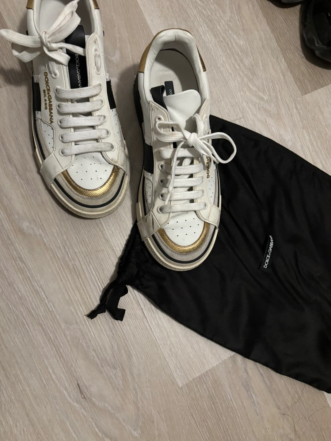 Selling a pair of Dolce & Gabbana sneakers. They're white with gold and black accents. Comes with the original dust bag and size 7.5