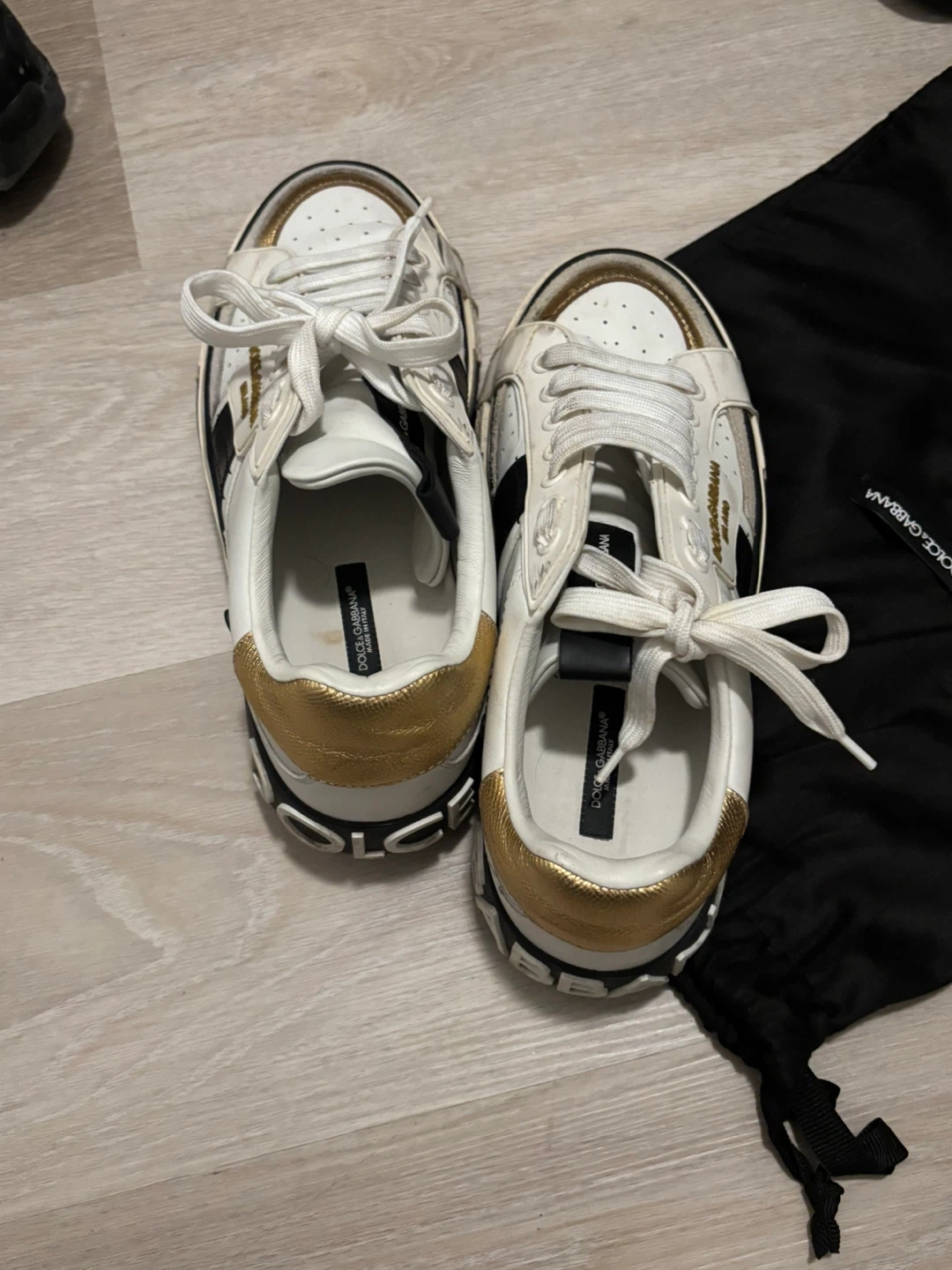Selling a pair of Dolce & Gabbana sneakers. They're white with gold and black accents. Comes with the original dust bag and size 7.5