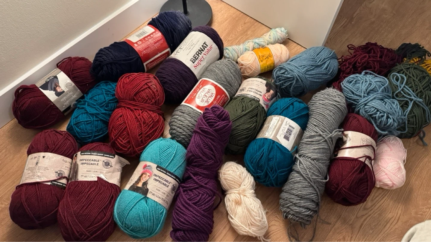 Selling a mixed bundle of yarn from Michael’s: 11 full skeins (mostly worsted/medium weight acrylic) plus a bunch of partial balls in coordinating colours. Lots of burgundy, teal, grey, green, etc. A little dusty in some areas as it wasn’t getting any love. Otherwise, great for blankets, amigurumi, scrap projects, or beginners wanting a stash to play with.