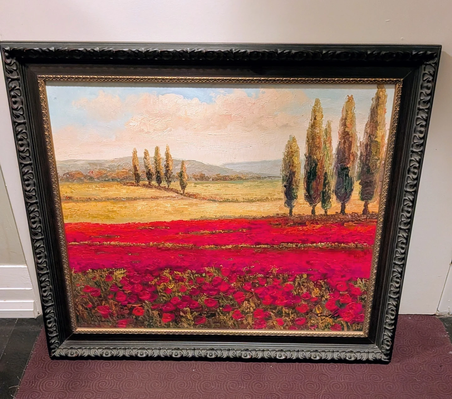 This is a landscape oil painting with a decorative frame. It features a field of red flowers and trees in the background. The frame is dark and ornate.