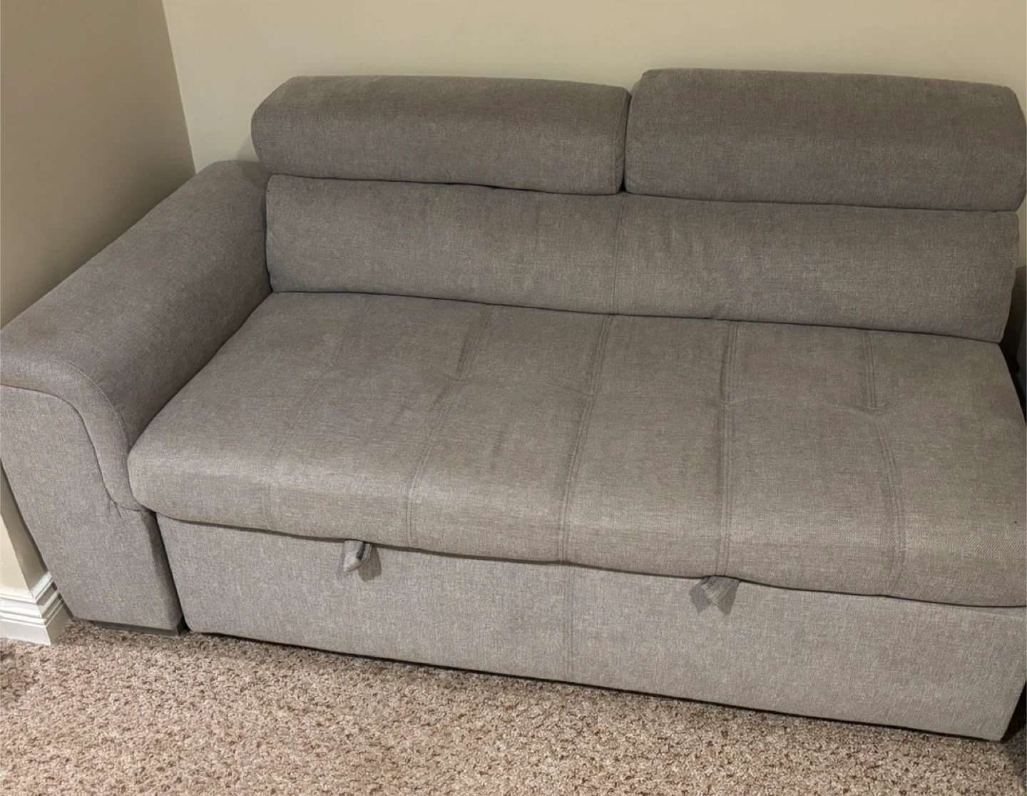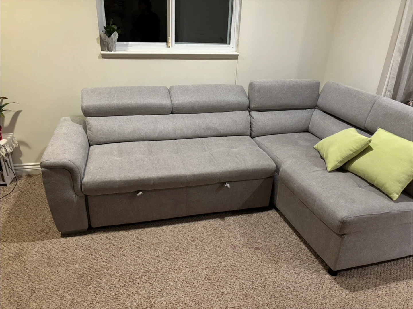 Selling a sectional sofa in a neutral grey colour. It features a convenient pull-out bed, perfect for guests or smaller spaces. It’s in good condition and ready for a new home!