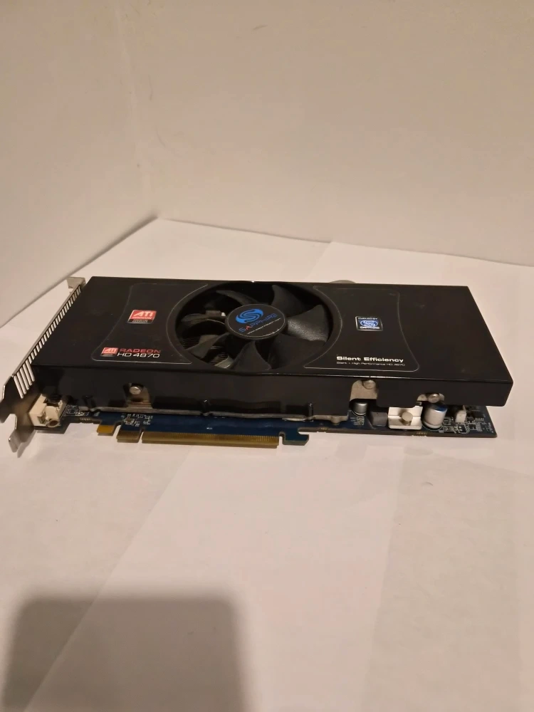 Selling a used Sapphire Radeon HD 4870 graphics card. It features a silent efficiency cooling system. Great for older PCs or as a backup card!