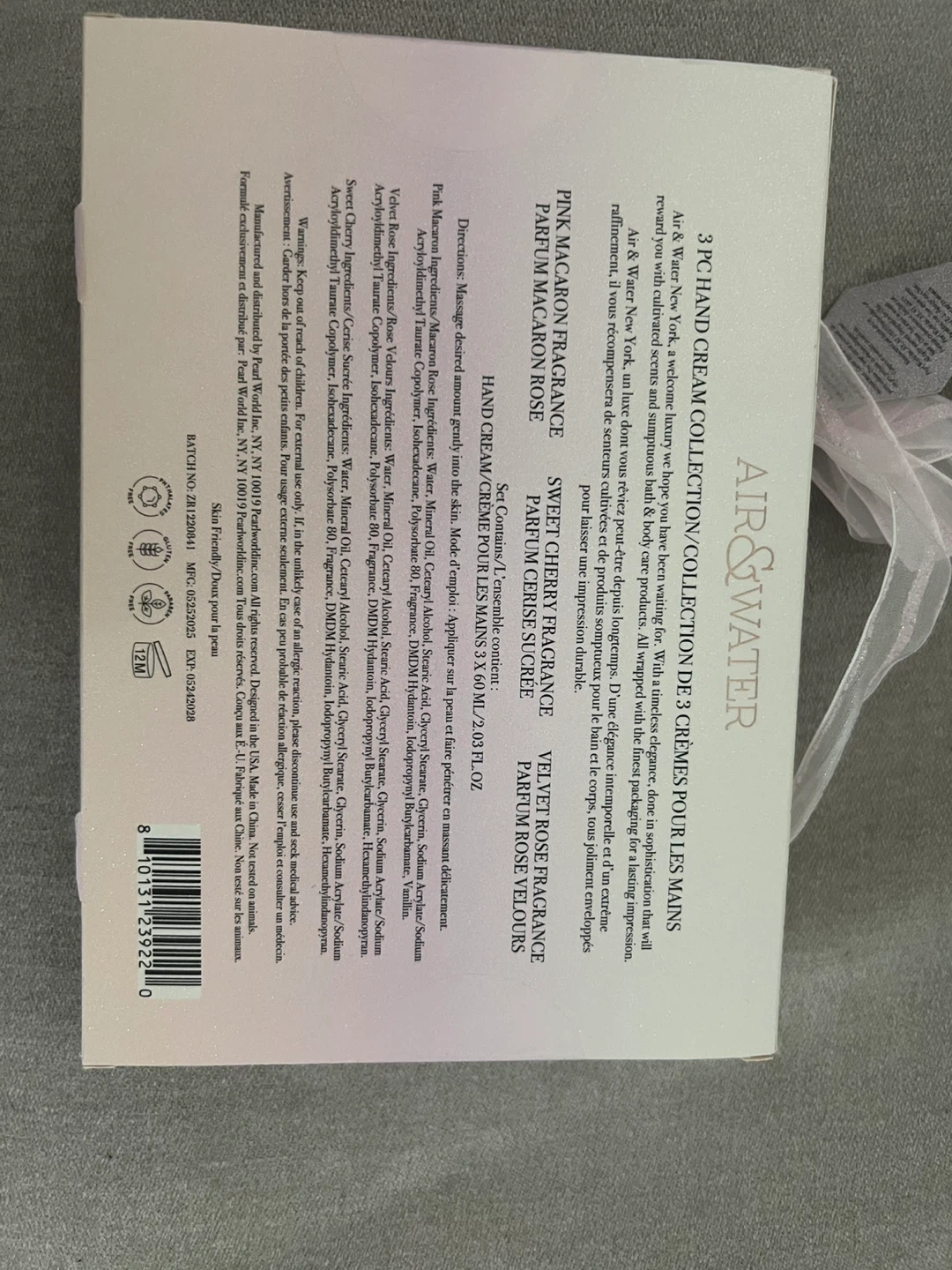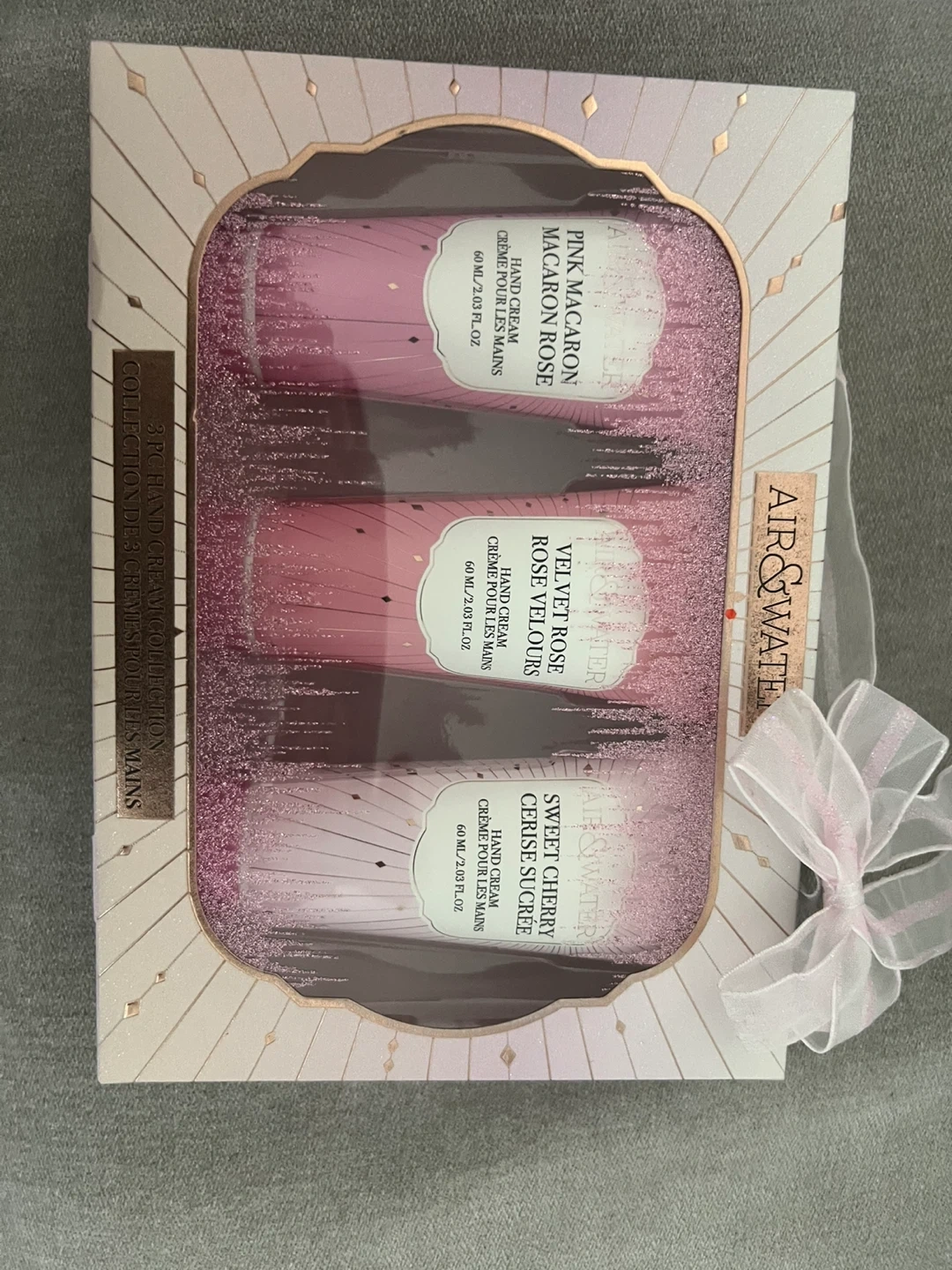 Selling a brand new Air & Water 3-piece hand cream collection! This set includes three delightful scents: Pink Macaron Rose, Sweet Cherry Cerise Sucree, and Velvet Rose Rose Velours. Each hand cream comes in a 60 ml / 2.03 fl oz size. These creams are perfect for keeping your hands moisturized and smelling lovely!