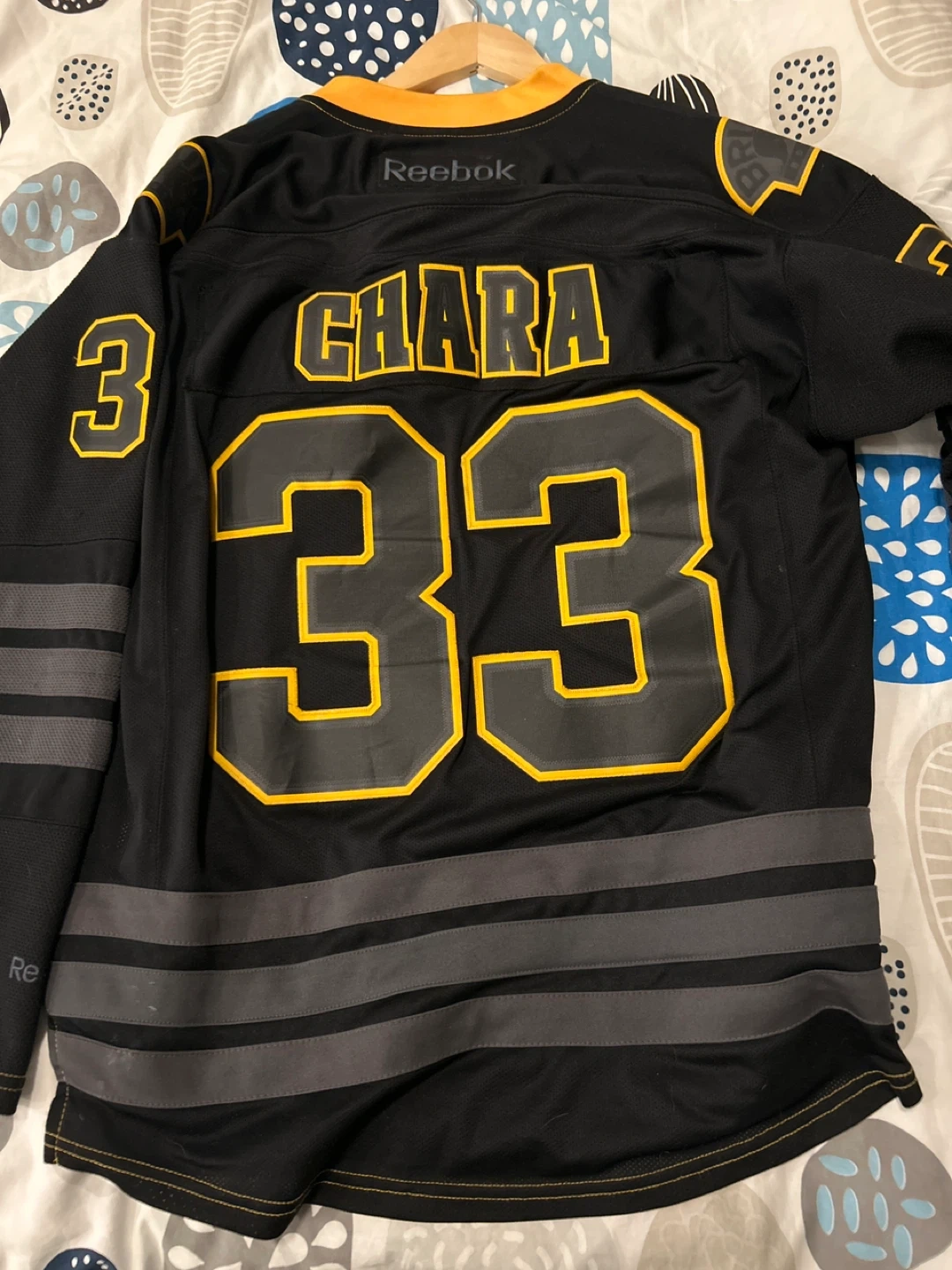 Selling a Reebok Boston Bruins jersey featuring Chara's name and number 33. It's a size M and in great condition! Perfect for any Bruins fan.