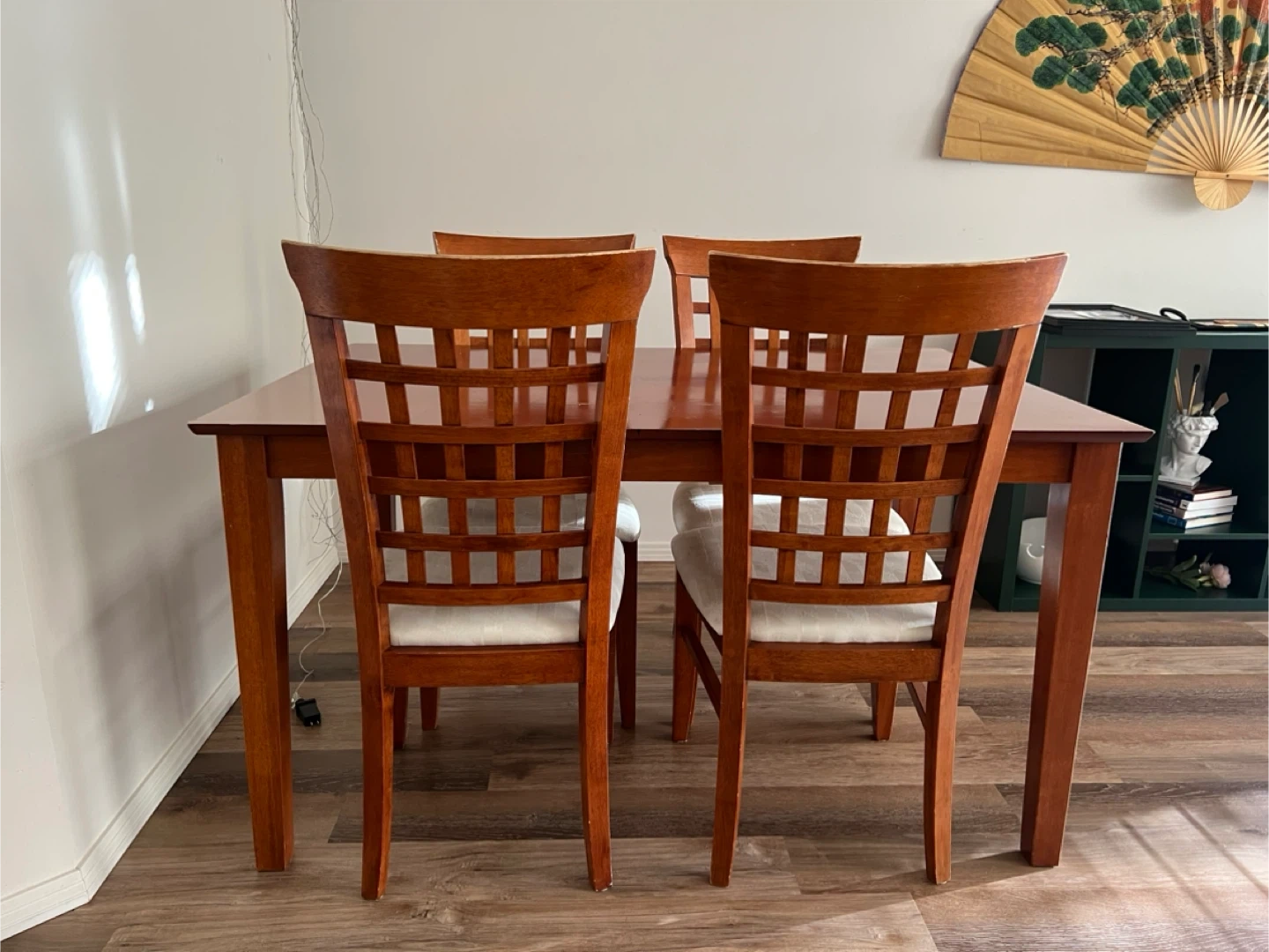 This is a real wooden dining table set that includes four chairs. There are some scratches on the table surface. All real wood, used to be an expensive piece, great for renovating. Coming from pet free smoke free home.