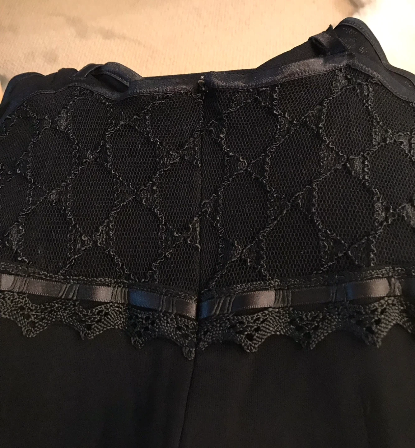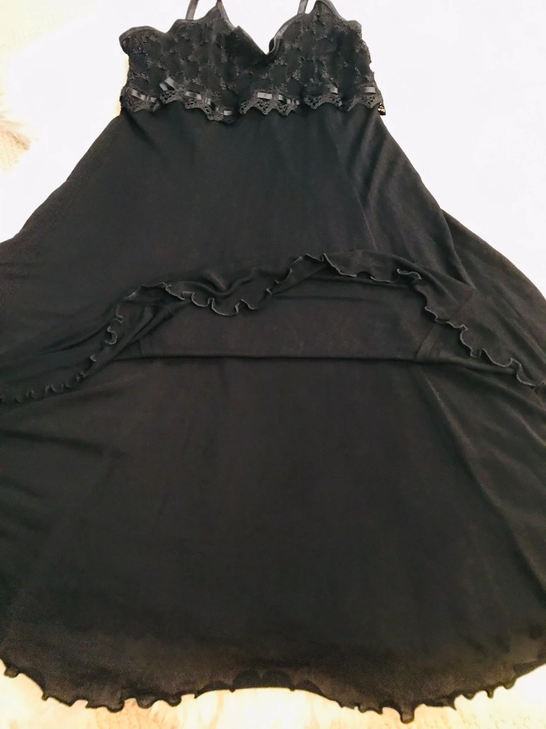 This is a cute black dress. It’s made in France , simple elegant and completely lined .It has lace details on the top and ruffles on the bottom and zipper closure at the back.It's in great condition and can be your black party dress for new year celebration or else.