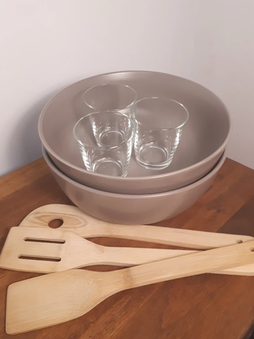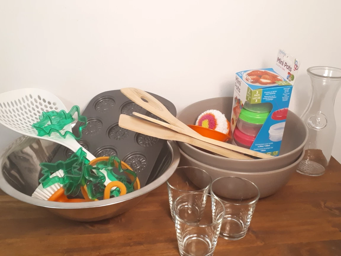 Giving away a bundle of kitchen and baking items! Includes a cookie tin, cookie cutters, serving and mixing bowls, glasses, spatulas, a brush, and a 3-pack of mini pots. Perfect for someone setting up a new kitchen or looking to expand their baking supplies