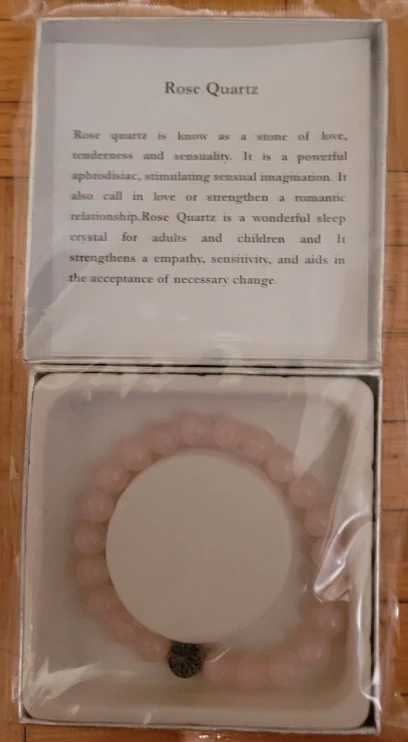 This is a rose quartz bracelet. Rose quartz is known as a stone of love, tenderness, and sensuality. It's a powerful aphrodisiac, stimulating sensual imagination. It is also said to call in love or strengthen a romantic relationship. Rose Quartz is a wonderful sleep crystal for adults and children and it strengthens empathy, sensitivity, and aids in the acceptance of necessary change