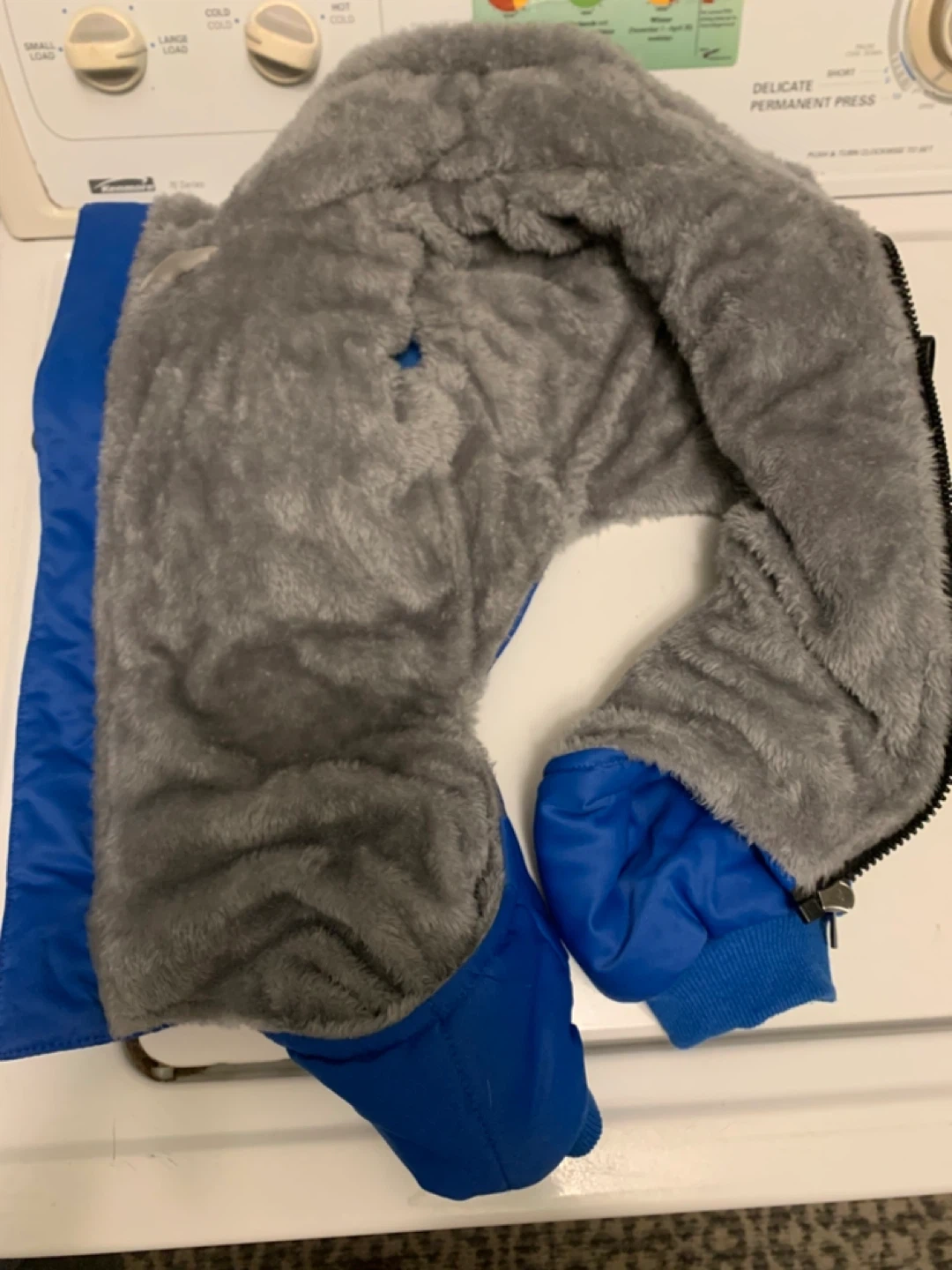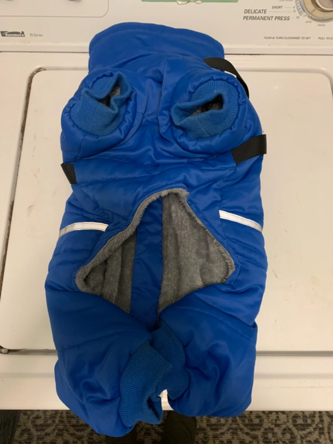 Selling a BRKURLEG blue dog winter coat in size large! It's a cozy winter dog jacket with a harness. Features include a onesie body, reflective windproof material, and four-legged puffer design. Perfect for keeping your furry friend warm during cold weather!