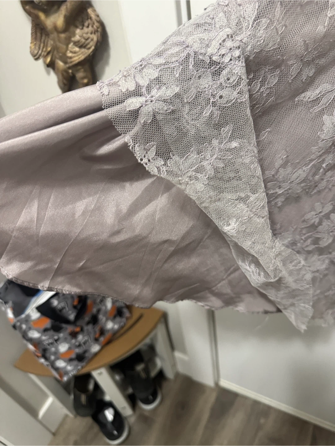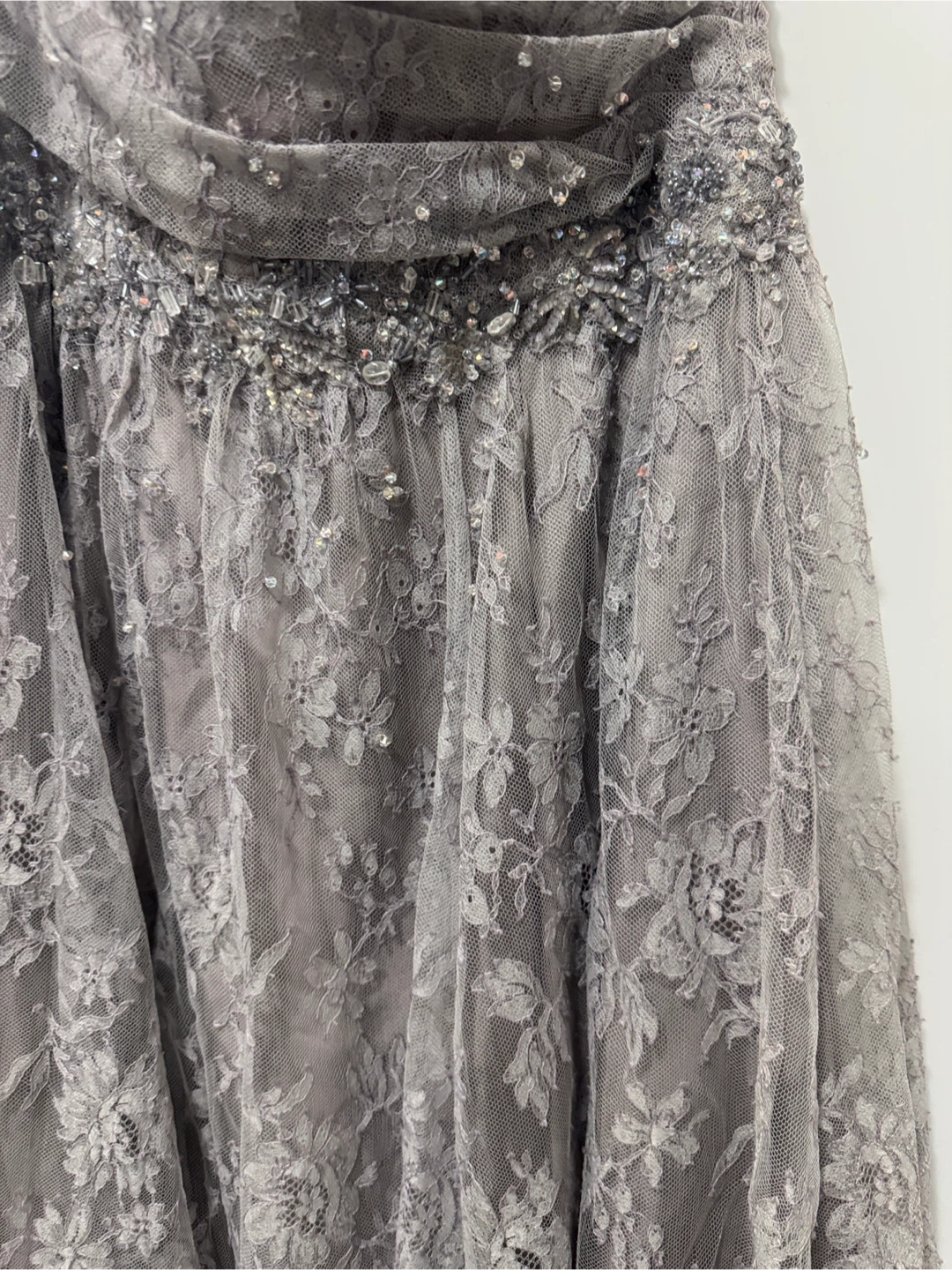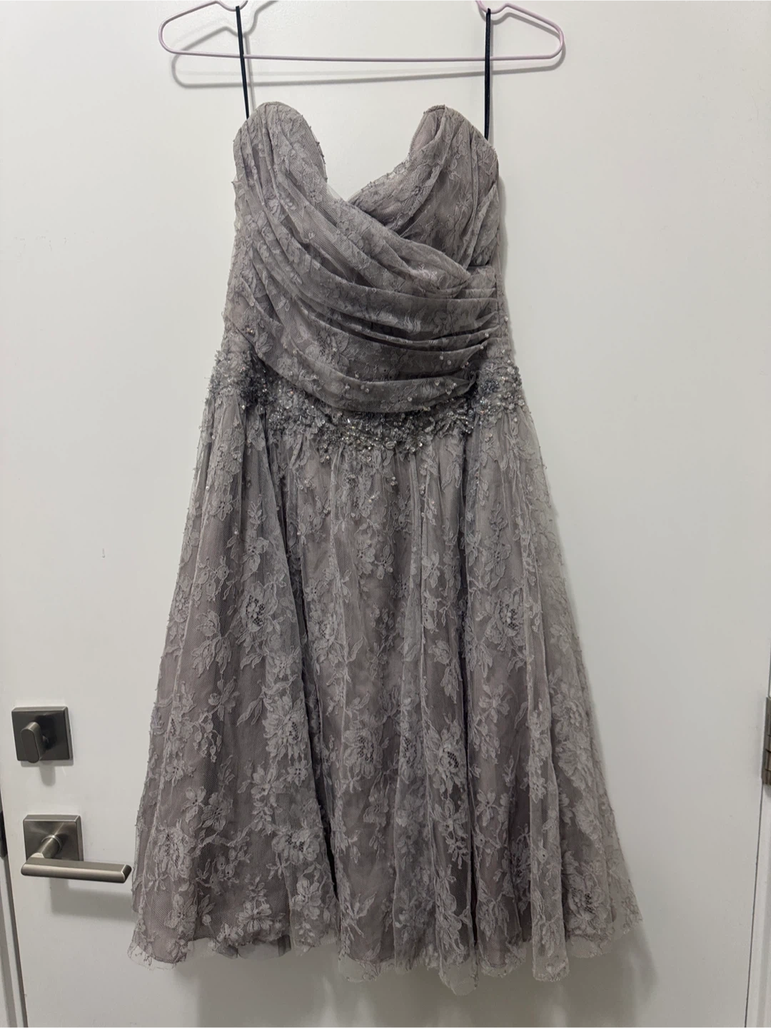This chic strapless dress in gray features exquisite lace detailing, perfect for elegant occasions. A few lolse beads but reflective in price. Boned & side zip no stretch