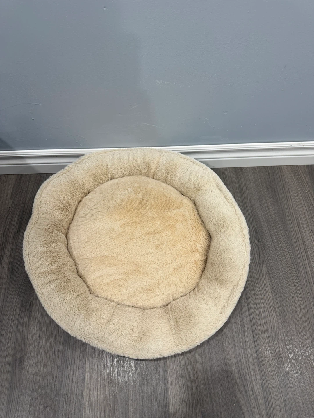 This Feandrea pet bed is perfect for your furry friend! It's a round shape with a soft, beige plush interior. The bottom is grey with a non-slip design. It's in great condition and ready for a new home!