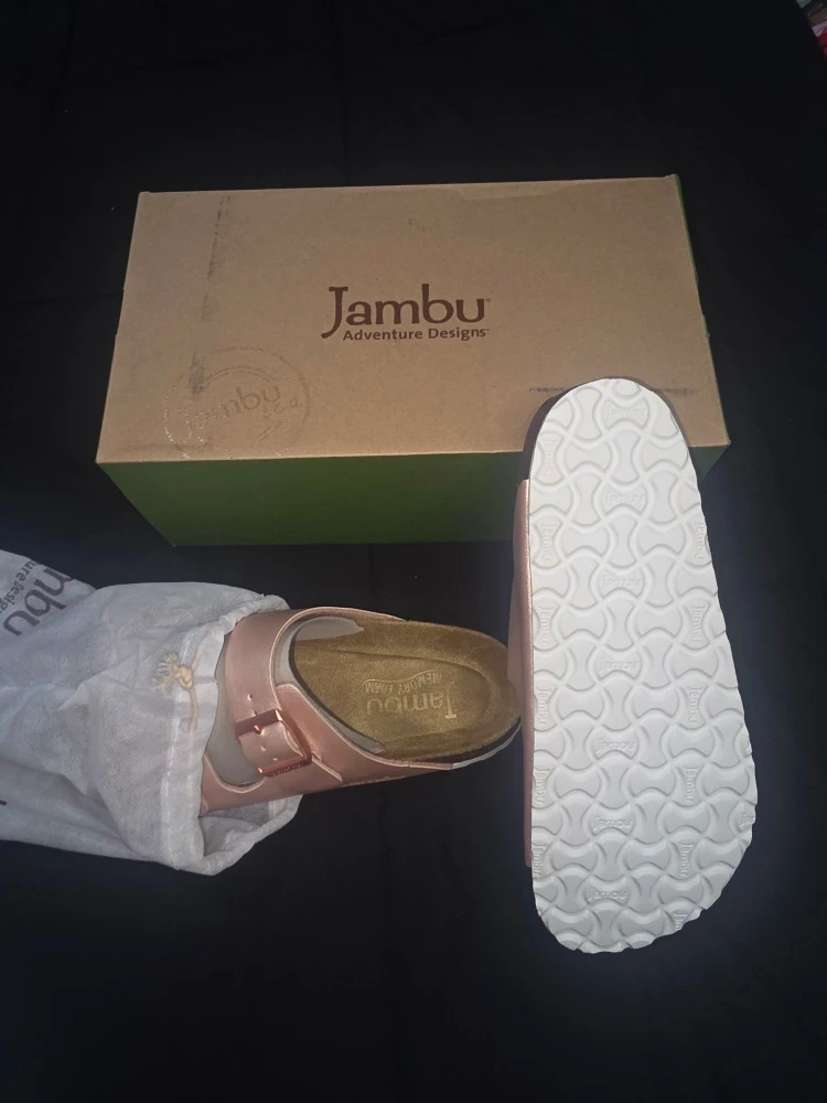 Selling a pair of Jambu Woodstock sandals in rose gold, women's size 9. They feature a comfortable memory foam footbed. The original box is included!