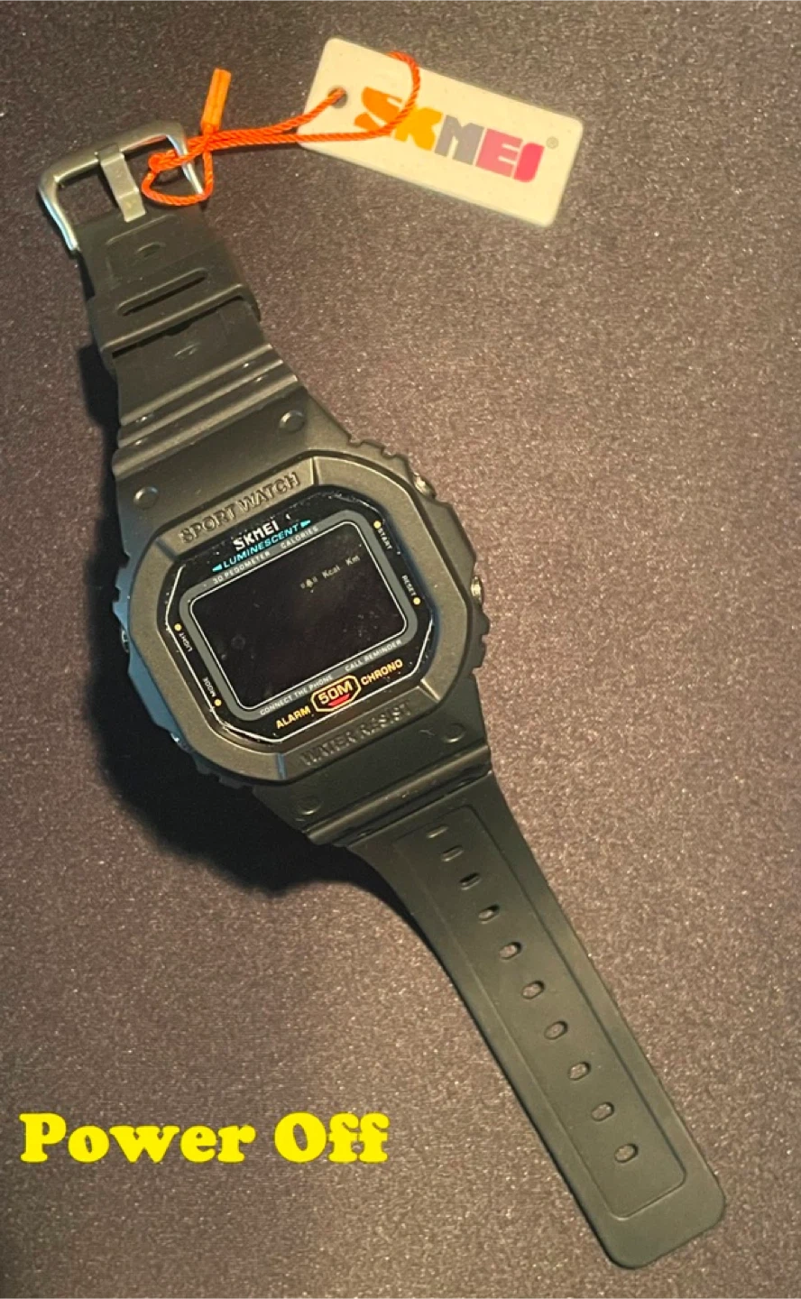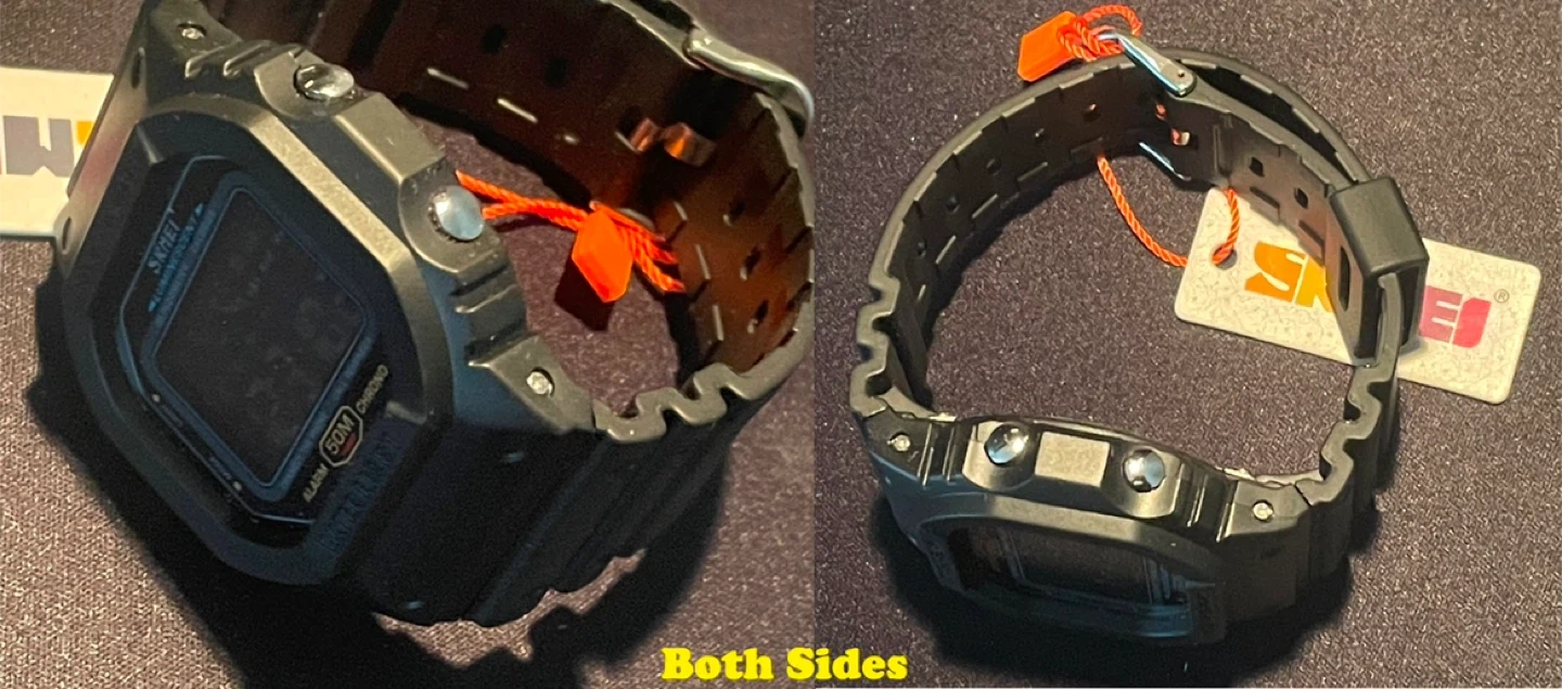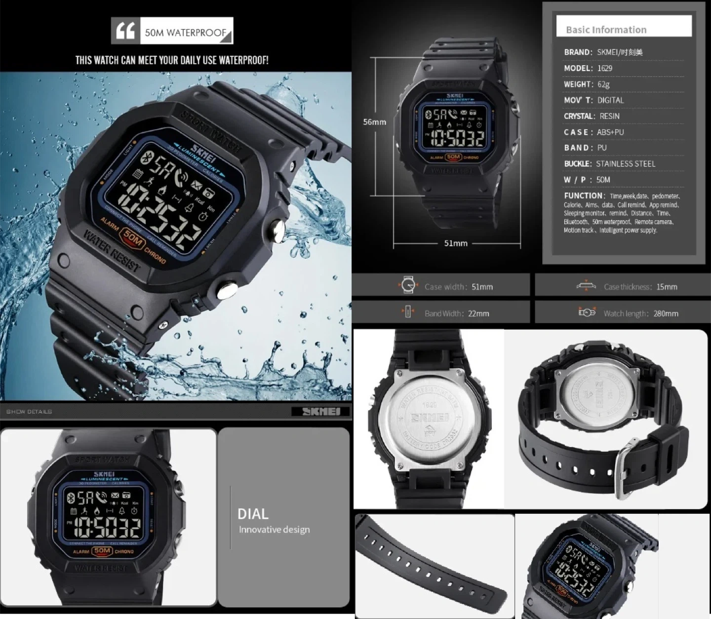 Case materials-ABS+PU; Band materials-Resin with Stainless Steel Clasp; 50m Water Resistance;
