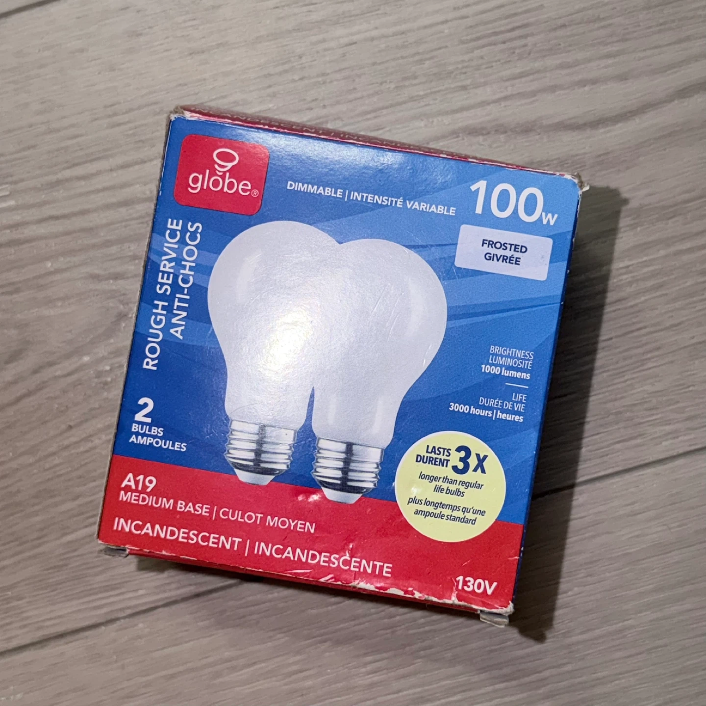 Globe Electric 2-pack of A19 frosted incandescent light bulbs. These bulbs are 100W, dimmable, and provide 1000 lumens. They have a medium base and a rated life of 3000 hours. Rough service, anti-shocks.