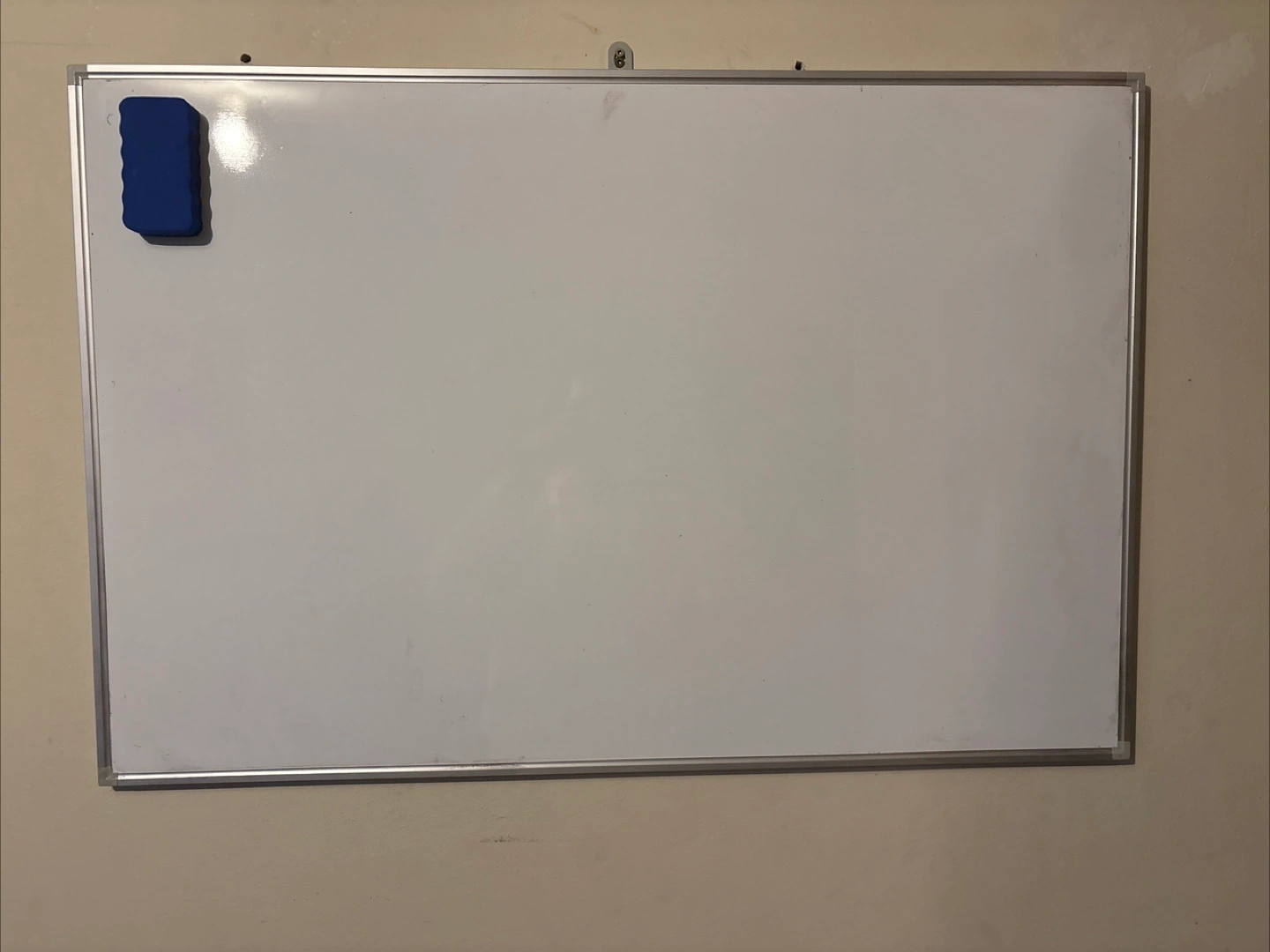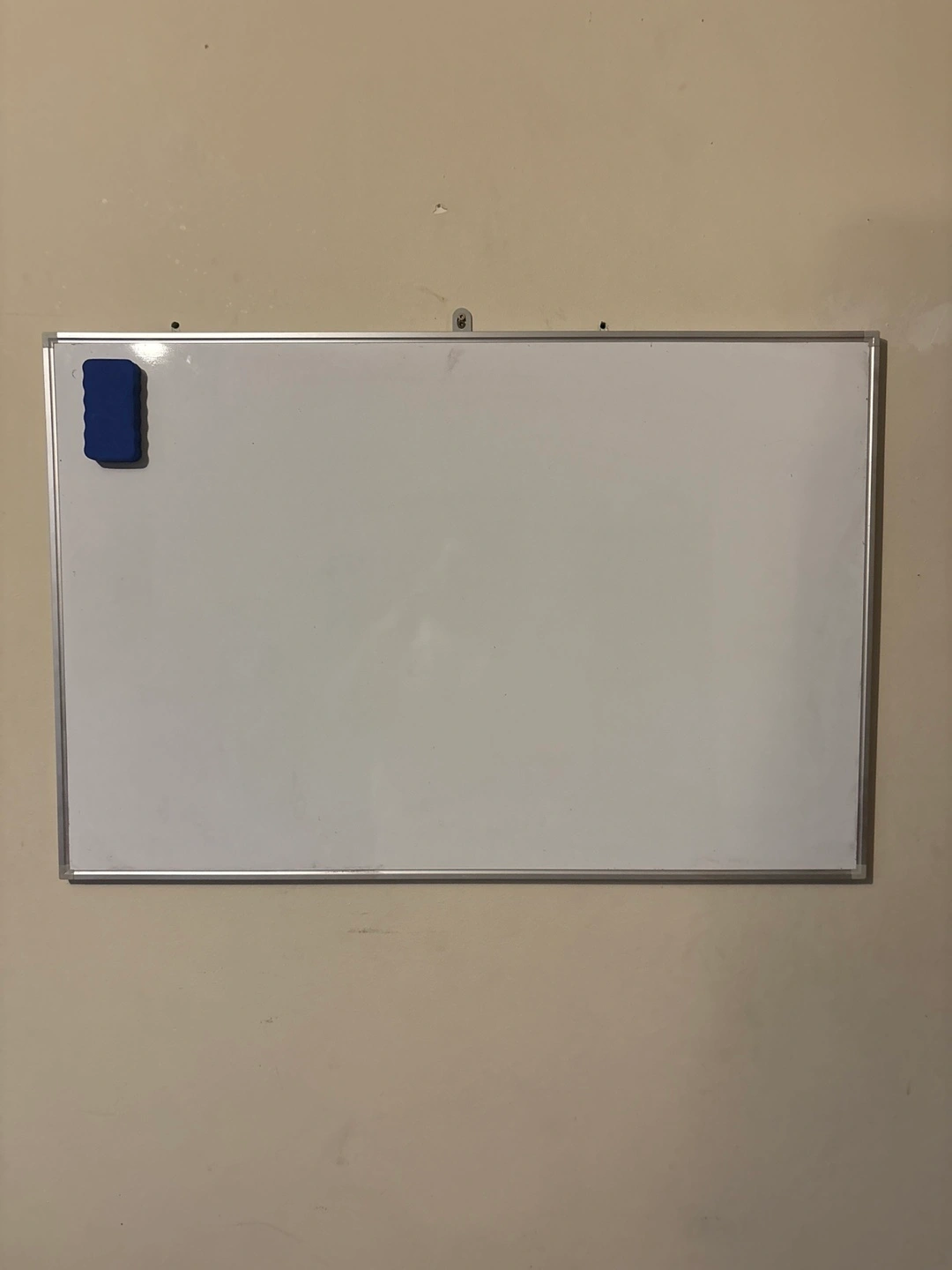 Whiteboard framed with a metallic border. Includes a blue eraser attached to the board. Perfect for taking notes or planning out projects, creating a calming space for your thoughts.