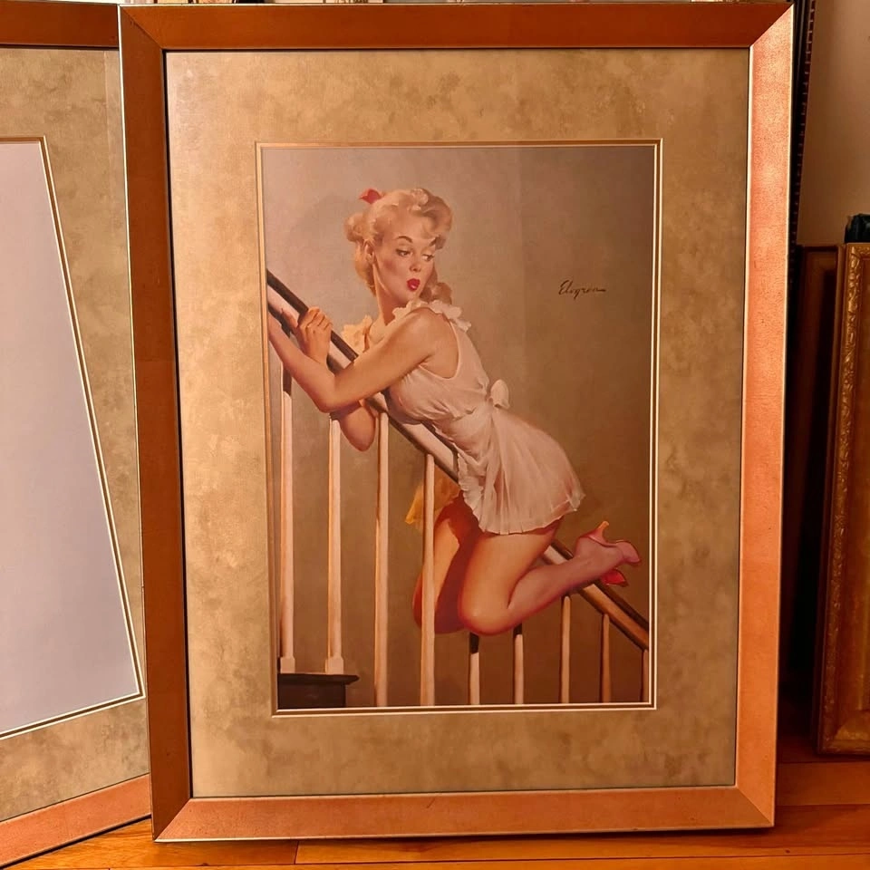Elvgren girl pin-up art print. Custom framed gold and black with cream suede matting. 19.5”w x 25”l x 2”d