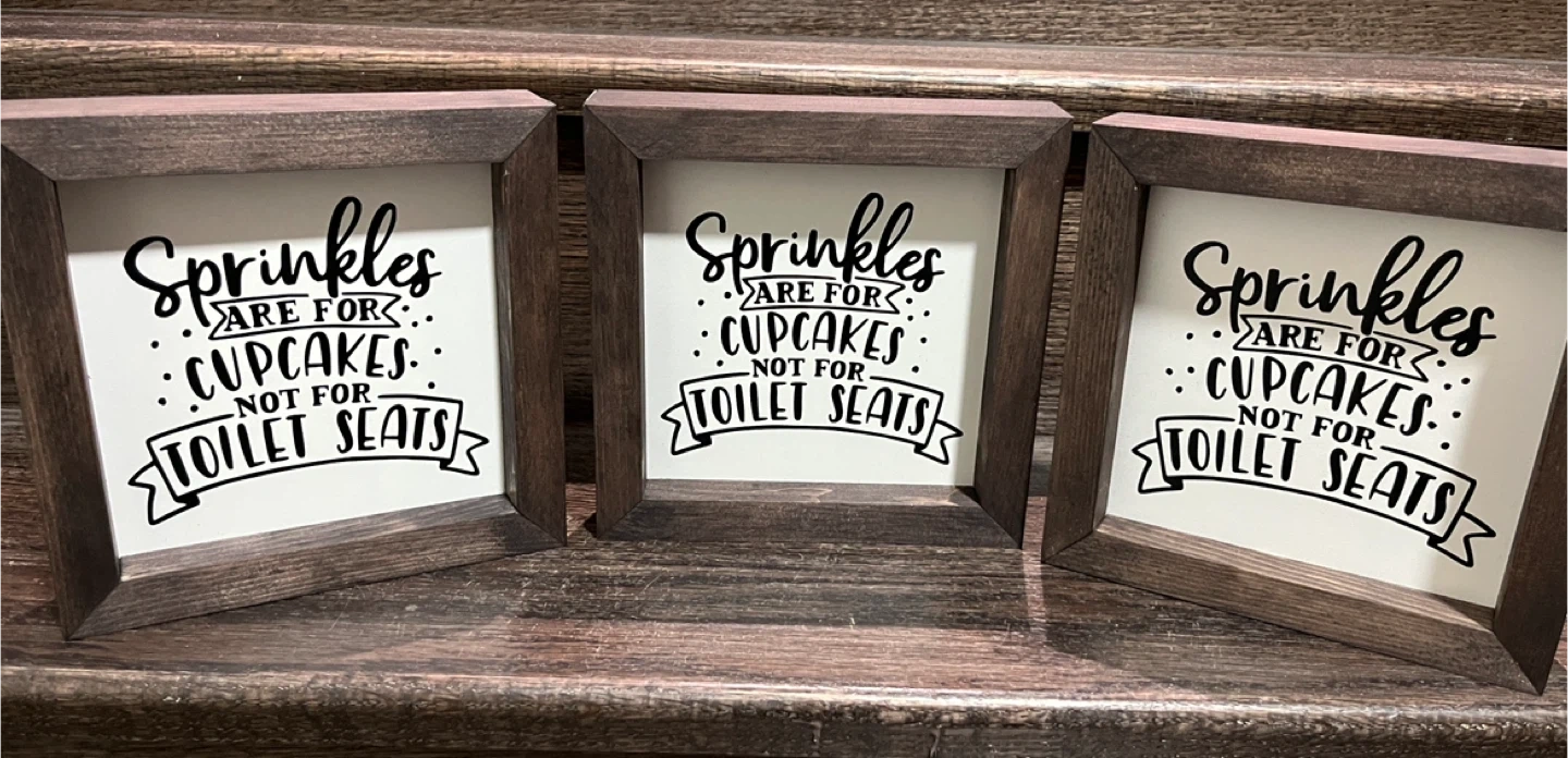 Cute framed sign that says, "Sprinkles are for Cupcakes, not for Toilet Seats"! It's perfect for adding a touch of humour to your bathroom decor. The frame is a dark wood tone, and the text is in black on a white background.