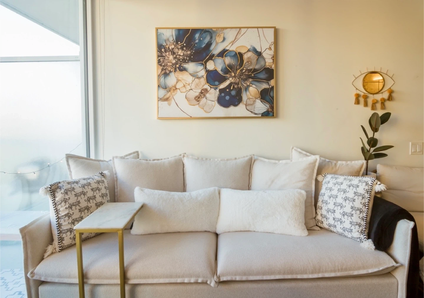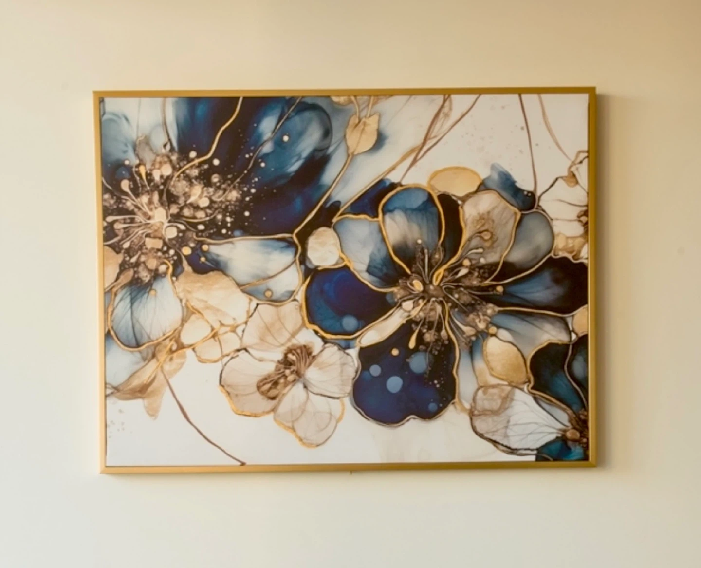 Beautiful blue and gold floral canvas wall art in a sleek gold frame. Modern, elegant, and perfect for living rooms, bedrooms, or entryways. Great statement piece without being too bold.
