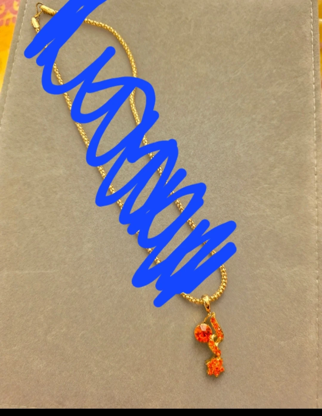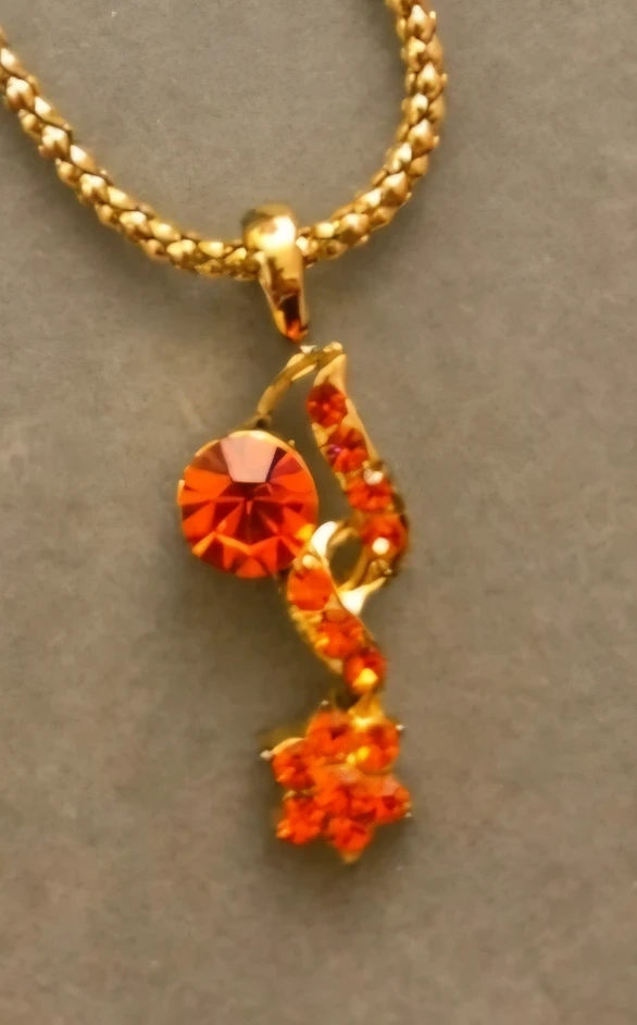 A lovely gold-coloured necklace with an orange stone pendant. The pendant features a round stone and an orange star-shaped design.