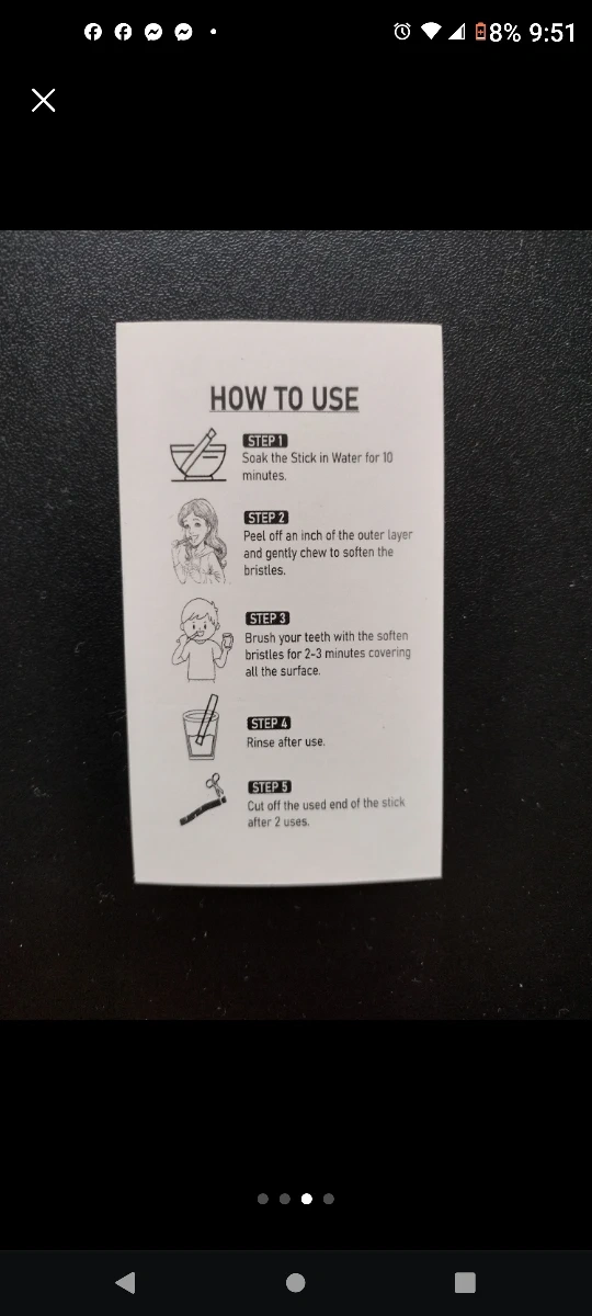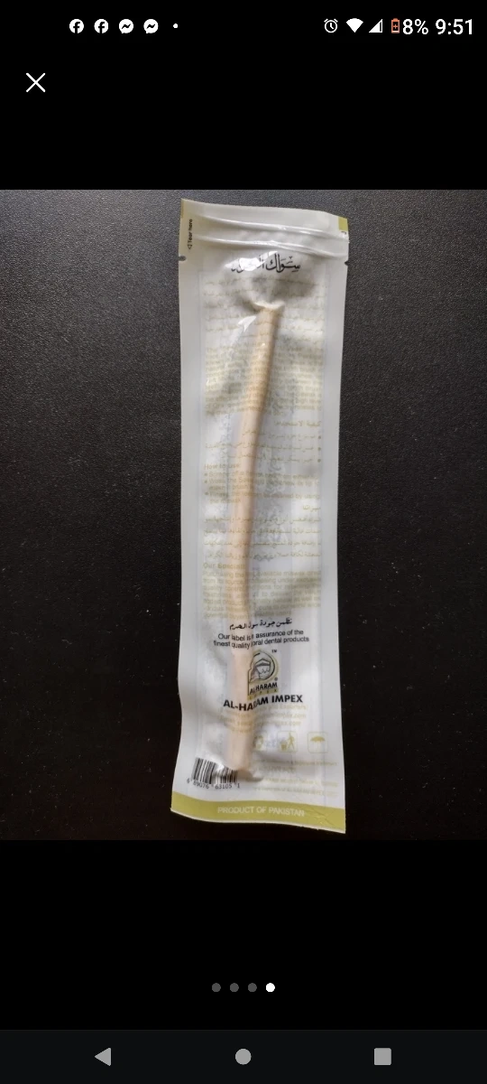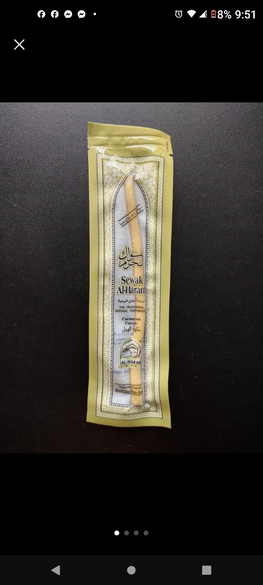 Selling a Sewak Al-Haram Miswak Stick, a natural toothbrush! It is a traditional and natural way to clean your teeth. To use, soak the stick in water for 10 minutes, peel off an inch of the outer layer, and gently chew to soften the bristles, then brush your teeth with the softened bristles for 2-3 minutes covering all surfaces, and rinse after use. Cut off the used end of the stick after 2 uses
